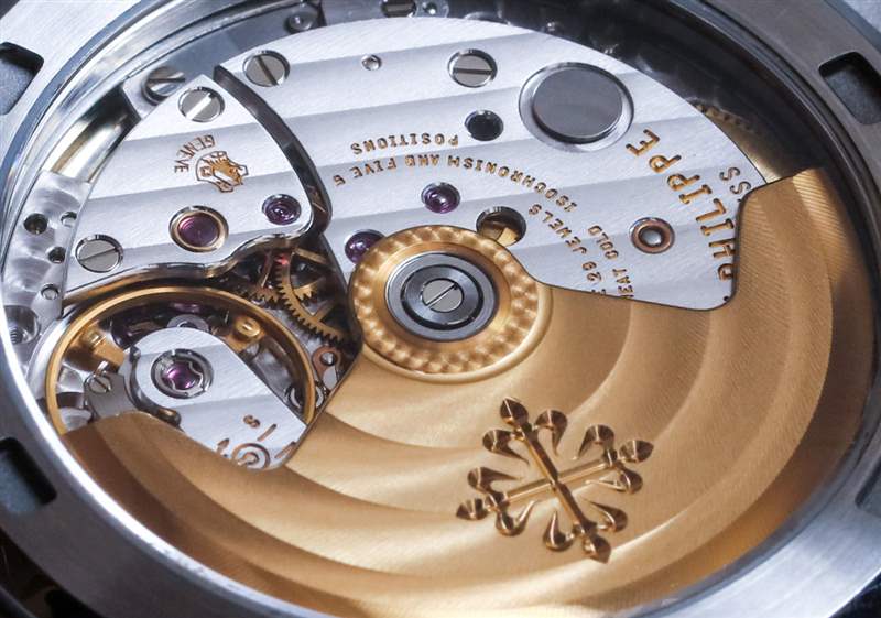 該機芯是您應該在簡單而高端的運動手表中尋找的一個很好的例子。讓 324 SC 型機芯令人印象深刻的除了其高水平的精加工外,還在于其纖薄的外形。機芯厚度僅為 3.3 毫米,總而言之,Nautilus 保持 120 米的防水性,盡管厚度僅為 8.3 毫米。自動轉子采用實心 21k 金制成,這實際上意味著它的重量足以保持較高的上鏈效率。該機芯以 4 赫茲(28,800 次/小時)的頻率運行,具有 45 小時的動力儲存,并且還配備了百達翡麗內部的 Gyromax 擺輪和 Spiromox 擺輪游絲。我會說性能可能與勞力士的“頂級天文臺”相當或在可觀的范圍內。然而,精加工是另一回事——百達翡麗用日內瓦波紋裝飾表面,小,