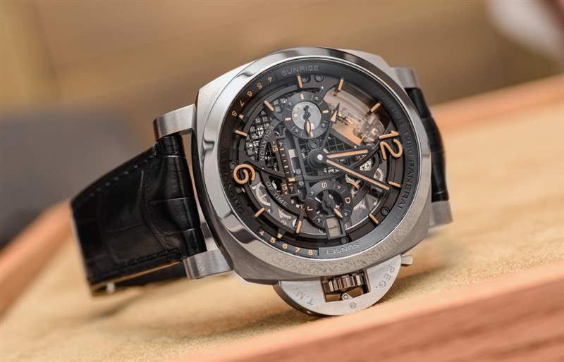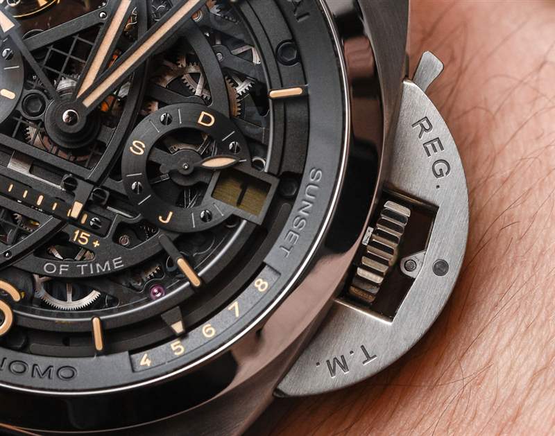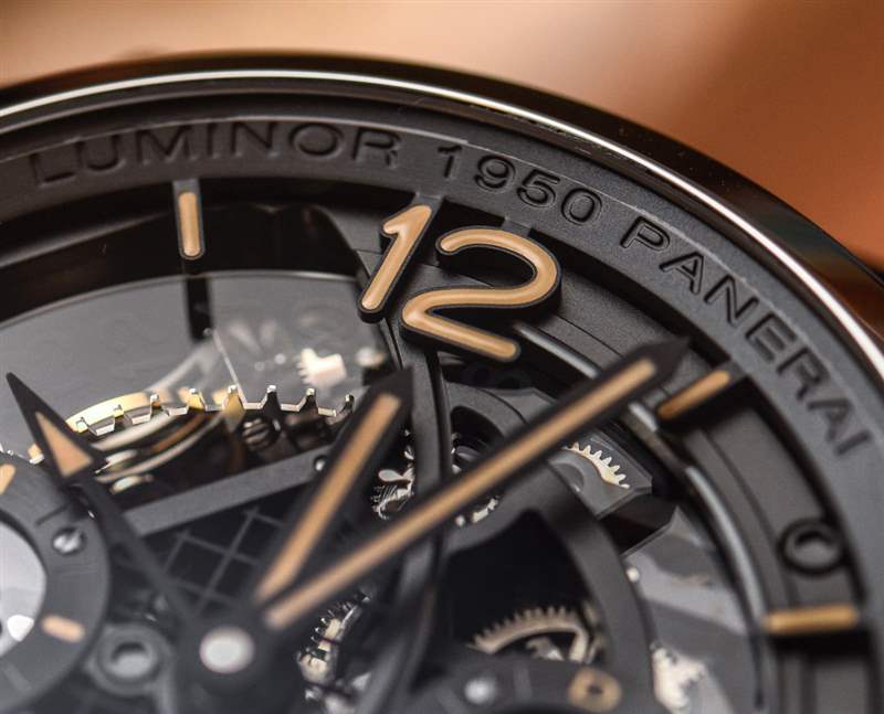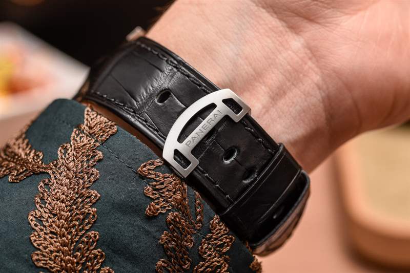 沛納海在日期指示器方面做了很多工作。為什么?原因是如果您仔細觀察,您會注意到雖然您可以在日期窗口中看到日期數字,但即使表盤是鏤空的,您也無法看到日期輪。酷吧?那是因為沛納海設計了一個使用兩片偏光玻璃的系統——其中一張是日期盤本身。在日期窗口的正上方,偏振平面以某種方式重疊,以便讓下盤的一半光線進入,因此,您可以看到日期。鑒于極化的工作原理,日期盤在其他任何地方幾乎都看不見。