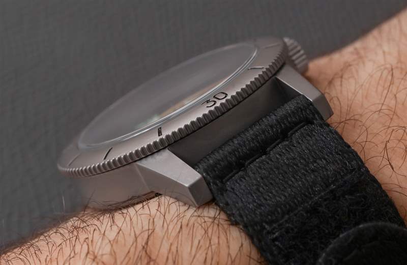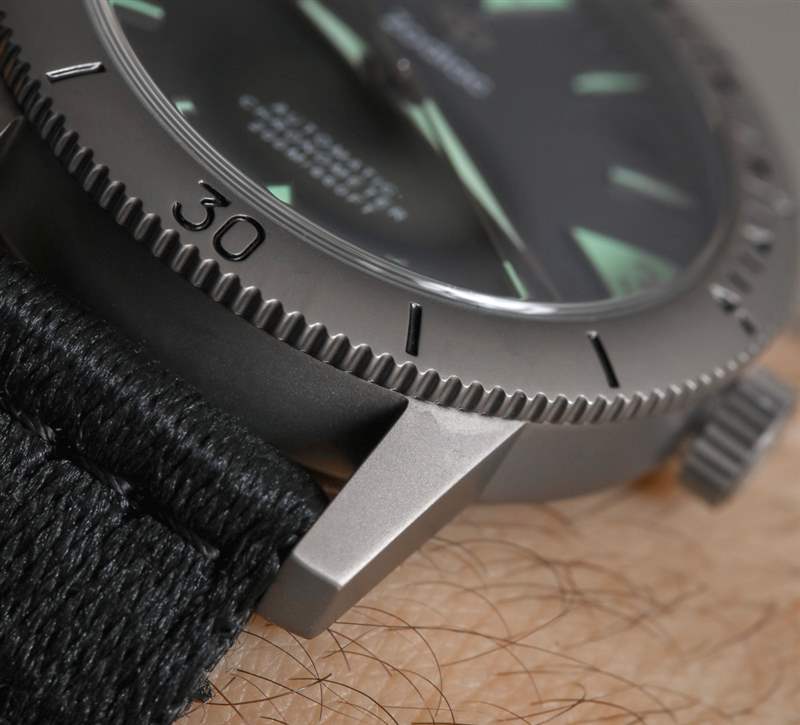雖然略微圓頂?shù)乃{(lán)寶石水晶鏡面確實(shí)有點(diǎn)眩光,但 Super Sea Wolf 的整體易讀性非常好,在黑暗中看到帶電的夜光本身就是一種特別的享受。發(fā)光體的厚度和顏色等特征,以及指針和時(shí)標(biāo)上細(xì)微的拉絲金屬表面表明,在這個(gè)價(jià)位的大多數(shù)其他工具手表中都缺少重要的細(xì)節(jié)水平。