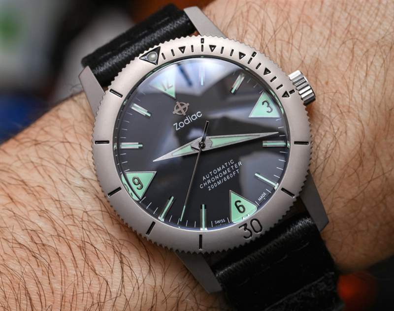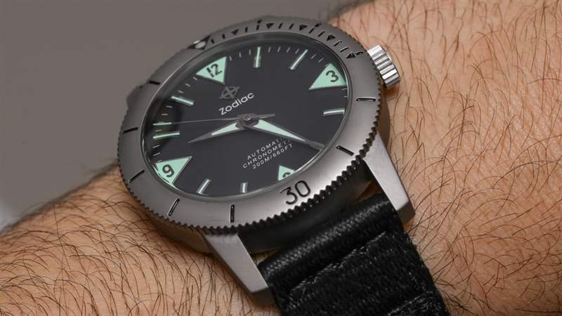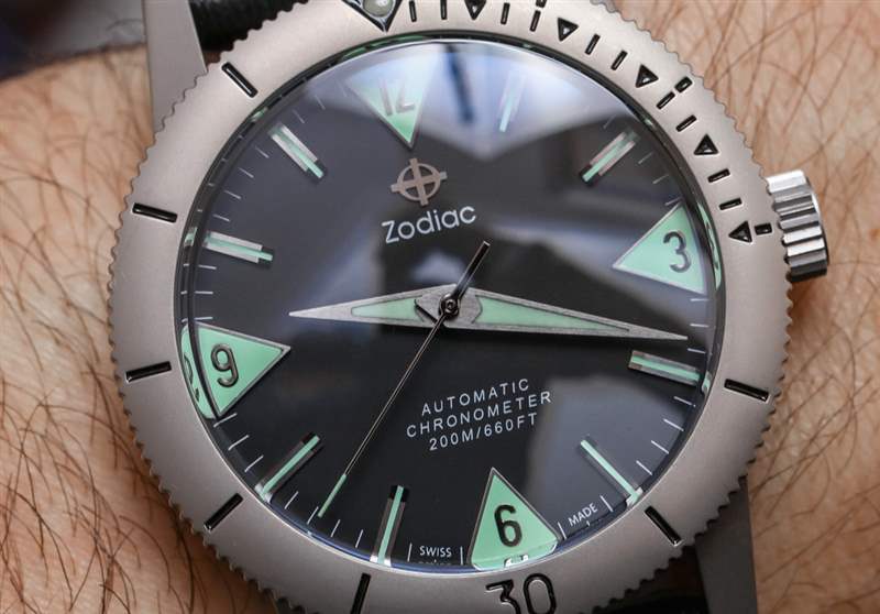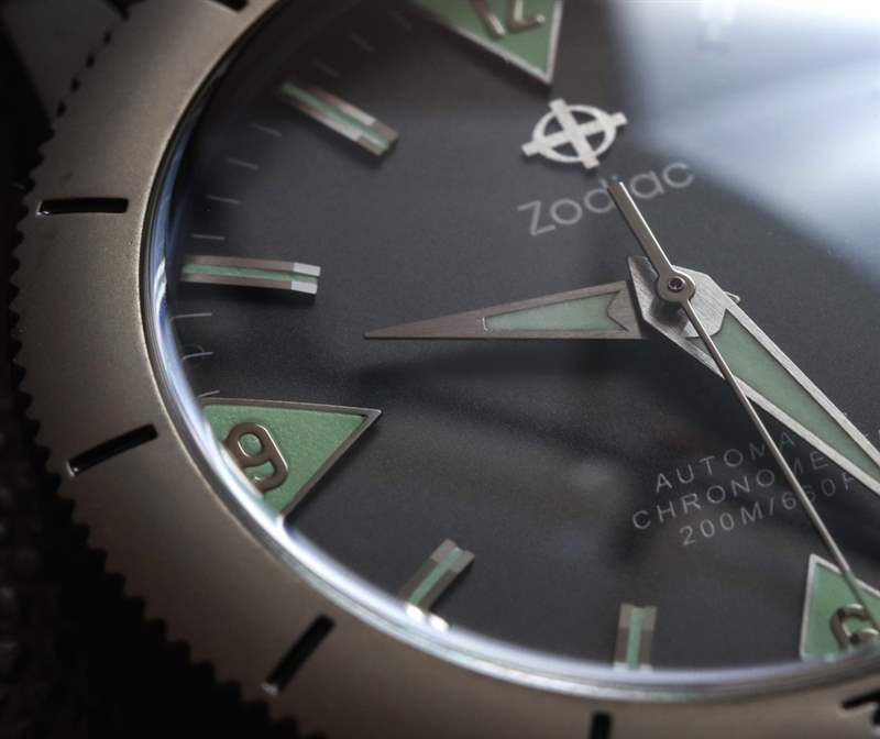 這種特殊的表盤風(fēng)格從未像 Zodiac 那樣被模仿過(guò),但您可以在許多 Eterna KonTiki 系列潛水表中看到它的標(biāo)志。四個(gè)相對(duì)的三角形時(shí)標(biāo)與太妃式指針一起使用,具有出色的易讀性和視覺(jué)效果。雖然這款限量版并不是唯一一款采用這種表盤風(fēng)格的手表,但 Zodiac 確實(shí)為這款限量版清理了它——我認(rèn)為結(jié)果非常好。限量版表盤的主要優(yōu)點(diǎn)之一是沒(méi)有日期窗口,因此 3 點(diǎn)鐘位置指示器取代了窗口,從而使表盤布局在視覺(jué)上更加對(duì)稱,從而令人賞心悅目。