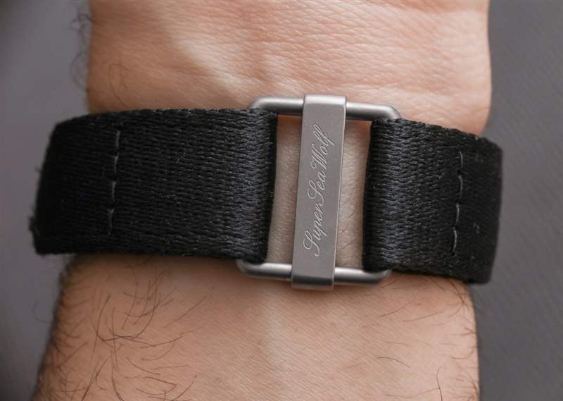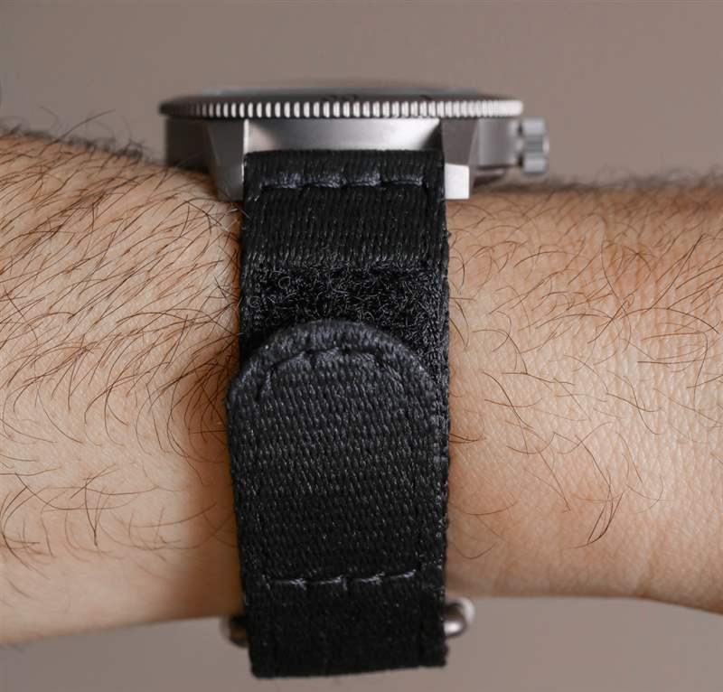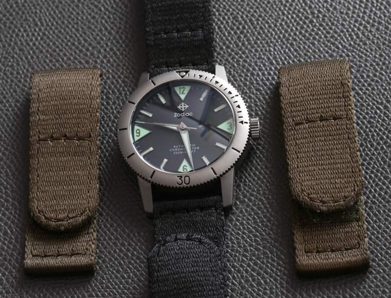 Zodiac 選擇為這款限量版 ZO9205 測(cè)試一條有趣的表帶,他們實(shí)際上包括兩種顏色:黑色和橄欖綠。織物帶的兩端都有魔術(shù)貼,以便更精確地貼合。一端塞入表帶下方,另一端塞入表帶,位于手表的“手腕內(nèi)側(cè)”一側(cè)。金屬扣用作兩個(gè)帶子末端的環(huán)以連接。更重要的是,這不是北約風(fēng)格的表帶,這意味著表殼底部沒(méi)有增加厚度,因?yàn)楸韼а仄溟L(zhǎng)度延伸。這意味著您可以擁有這款表帶有趣和舒適的外觀(非常適合體育活動(dòng))和低調(diào)的坐姿,而其他版本的 Super Sea Wolf 53 也可以在金屬表鏈上使用。
