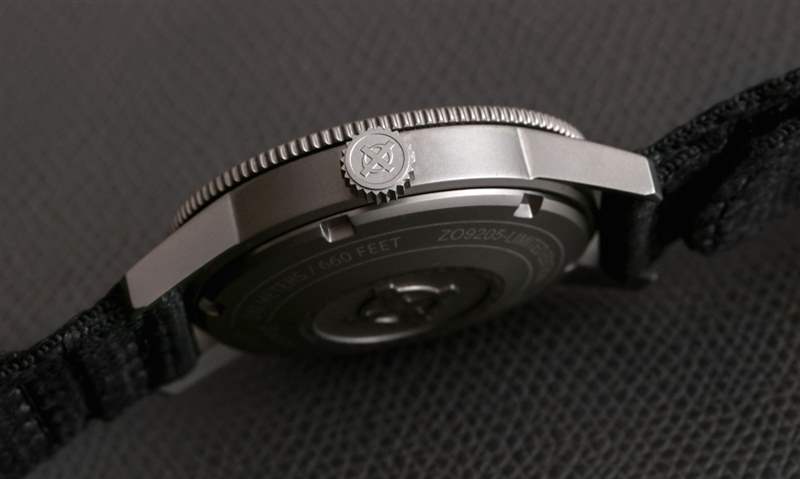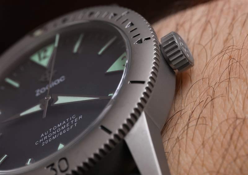 與其他 Zodiac Super Sea Wolf 53 型號(hào)的鋼相比,深灰色表殼是鈦金屬。請(qǐng)注意,這款限量版 ZO9205 去掉了名稱中的“53”部分。由于重量較輕,鈦金屬使這款尺寸適中的手表佩戴起來(lái)更加舒適——這是顯而易見(jiàn)的。表殼防水深度達(dá) 200 米,帶有旋入式表冠,單向表圈牢固地咔噠一聲,沒(méi)有任何明顯的擺動(dòng)。