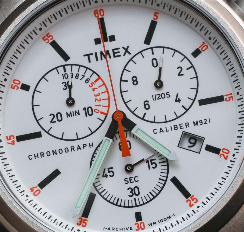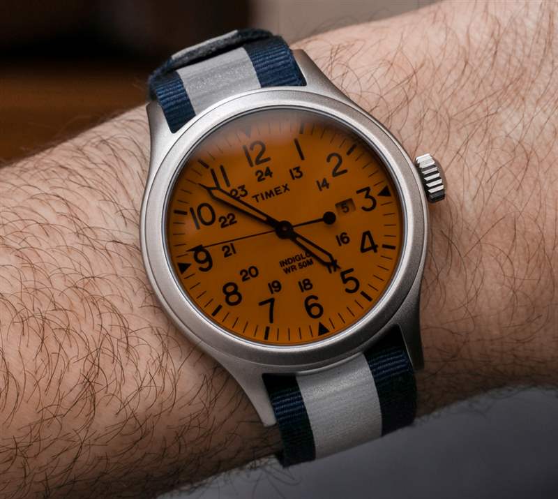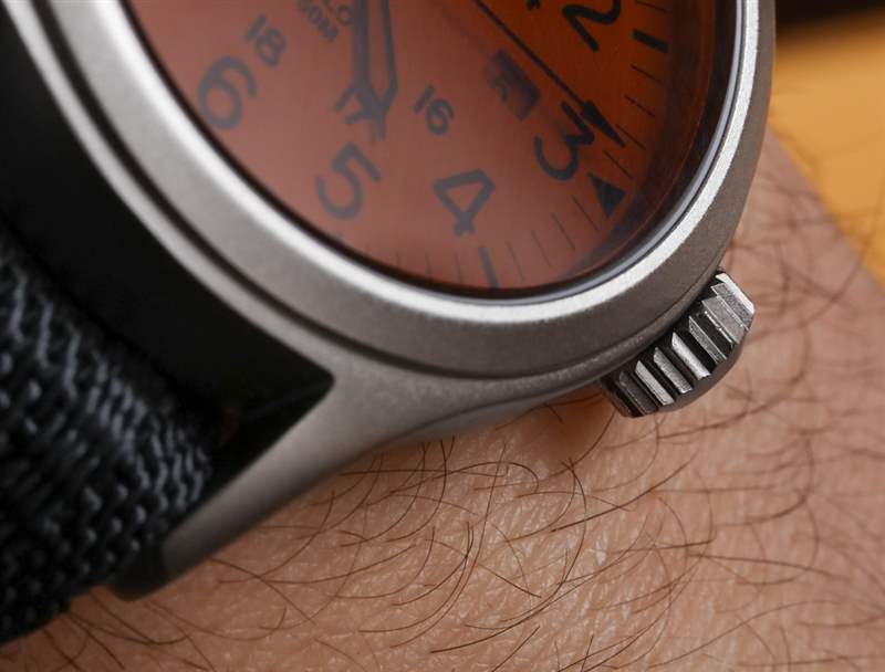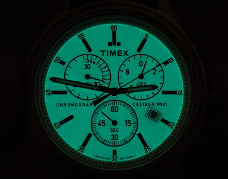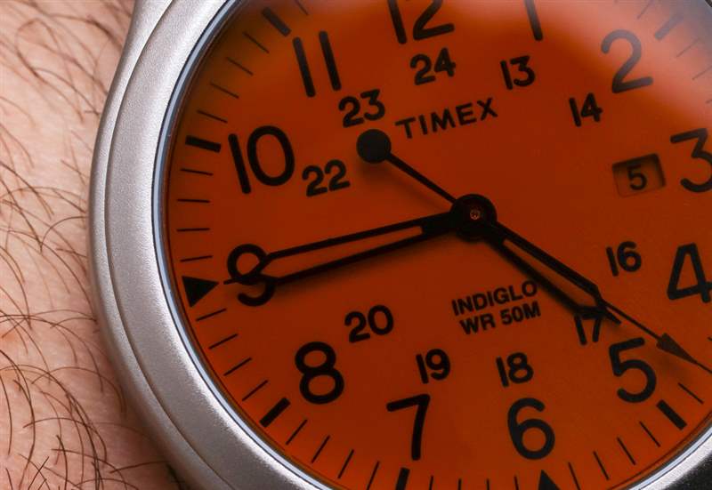 Allied Chrono 表殼防水深度達 100 米,手腕上的寬度為 43 毫米。Timex 指出,表殼材料是黃銅(就像許多機械手表機芯部件一樣),而外部是鋼。他們并不完全清楚這是如何實現的,盡管我猜外面的鋼是電鍍的,然后進行了噴砂處理。Allied Chrono 表盤簡單(以復古風格的方式)但清晰且有吸引力。表盤的“淺水泥”色與略帶光澤的時標和橙色裝飾相得益彰。指針尺寸合適,易于閱讀,同時還涂有發光體。我想在這里向 Timex 提出一個建議,即指針的顏色與時標的顏色相同,以進一步實現美學和諧。迷失在黑暗中觀看你說?不在這里。我們大多數手表收藏家早已忘記了 Timex 的標志性功能,即他們稱之為 INDIGLO 的背光。該功能仍然像我小時候第一次玩它時一樣整潔 – 通過按下表冠來激活。按下表冠時,整個表盤會發出“外質”綠光,即使在完全黑暗的環境中也能輕松讀取。所以也許讓雙手變黑并不是一個糟糕的主意……或者至少是黑色的輪廓。