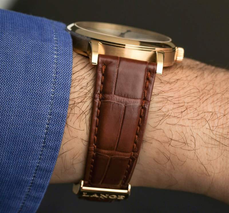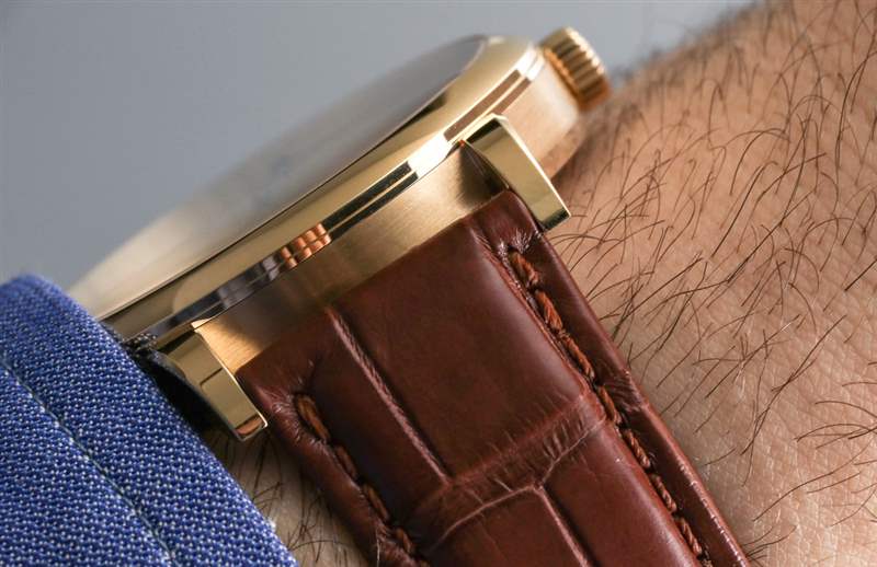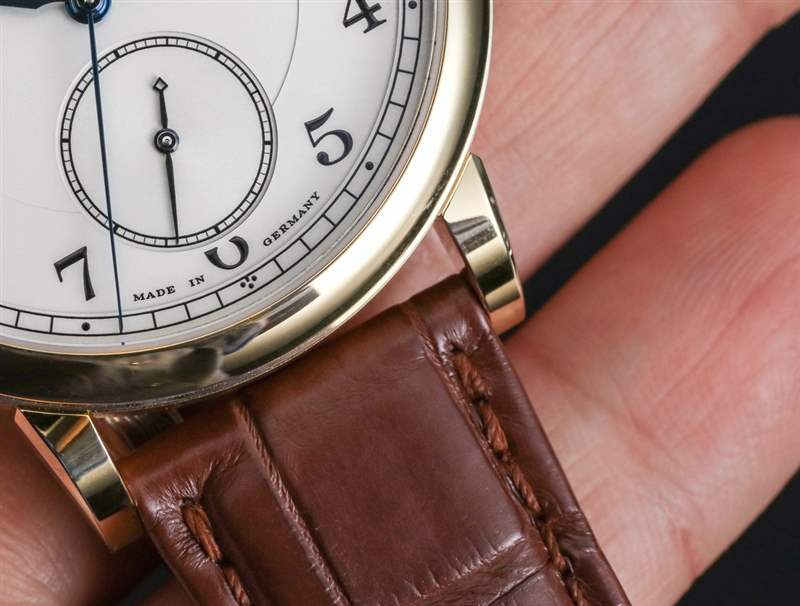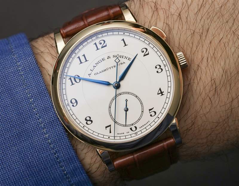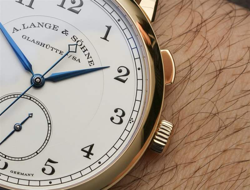 讓我解釋一下跳秒并發癥。位于表冠上方的按鈕用于啟動和停止中央跳秒針的運動。沒有重置或類似的東西。指針沿著正常的順時針路線開始和停止。名稱的跳躍部分指的是中央秒針“滴答”的事實。這通常被稱為“跳動”秒針,但這個詞并不受歡迎,因為營銷人員不喜歡它。他們也經常不喜歡它,因為跳動的秒針也恰好看起來像大多數石英手表上滴答作響的秒針的運動。話雖如此,1815 Homage to Walter Lange 的表盤確實有一個掃秒針——在小表盤上。