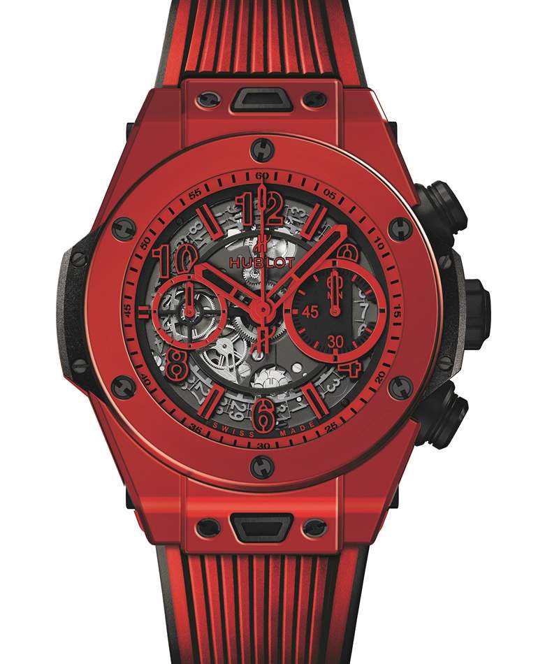 得益于宇舶表及其材料工坊,紅色陶瓷得以誕生。在 2018 年巴塞爾鐘表展上,瑞士宇舶表將推出首款紅色陶瓷表殼腕表,型號(hào)為 411.CF.8513.RX 宇舶 Big Bang UNICO Red Magic,限量 500 枚。Big Bang UNICO Red Magic 采用黑色和紅色,配備紅色陶瓷表圈和表殼。你問有什么大不了的?這一切都在顏色中。