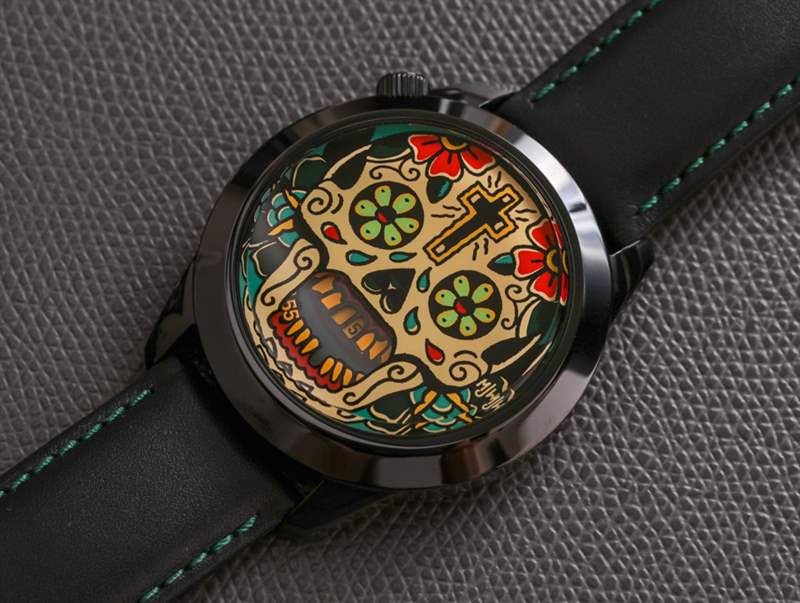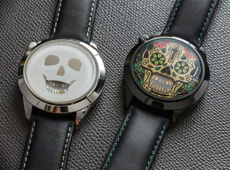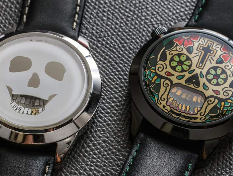 有趣的是 The Last Laugh 和 Last Laugh Tattoo 的比例如何運(yùn)作良好,這些表盤的尺寸略有增加。兩款手表中比較前衛(wèi)的是Mr. Jones Watches Last Laugh Tattoo XL。這使用了受墨西哥亡靈節(jié)藝術(shù)美學(xué)啟發(fā)的“彩繪”頭骨。這款腕表采用黑色精鋼表殼,搭配黑色皮革表帶,搭配對比色綠松石色縫線,與表盤的部分色調(diào)相得益彰。