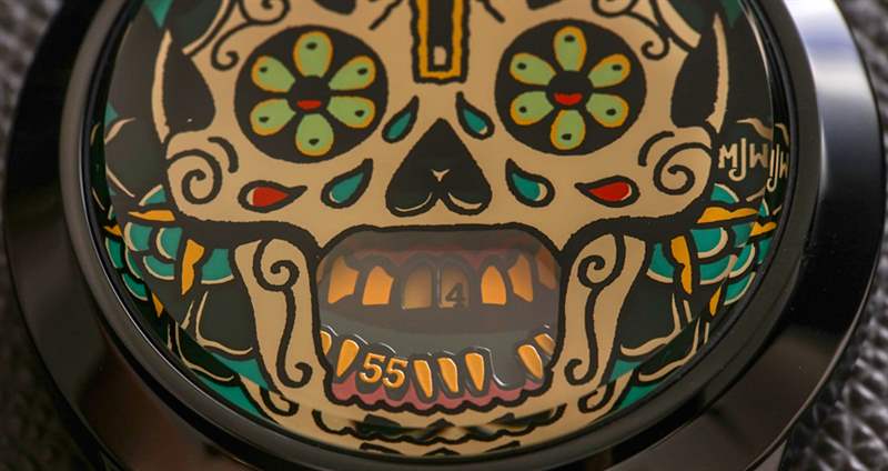 Last Laugh 和 Last Laugh Tattoo 腕表采用改良的中國制造機(jī)械機(jī)芯 TY1723 自動機(jī)芯。否則,這種罕見的運(yùn)動不可能有這么低的價格。機(jī)芯在三個圓盤上顯示時間(兩個用于小時顯示,一個用于分鐘顯示),這些圓盤設(shè)計(jì)在表盤上骷髏的齒中。易讀性主要受到較小尺寸的牙齒的影響,但總體而言,該概念確實(shí)提供了足夠的易讀性,可以在良好的照明條件下讀取時間。