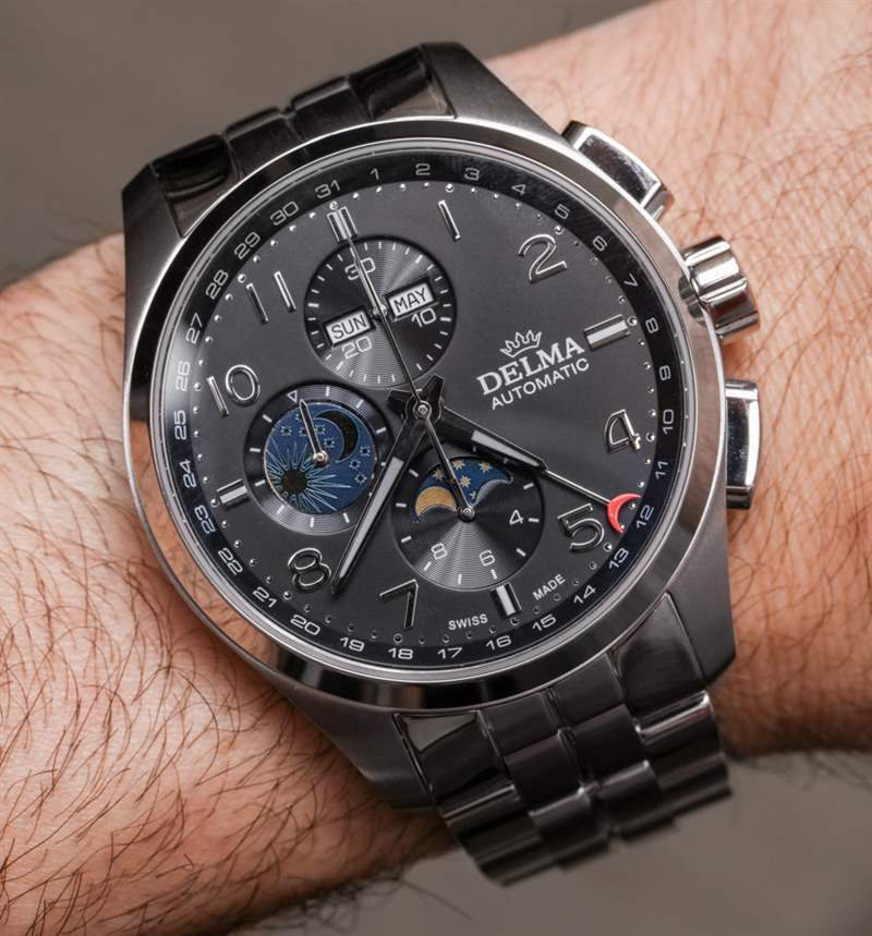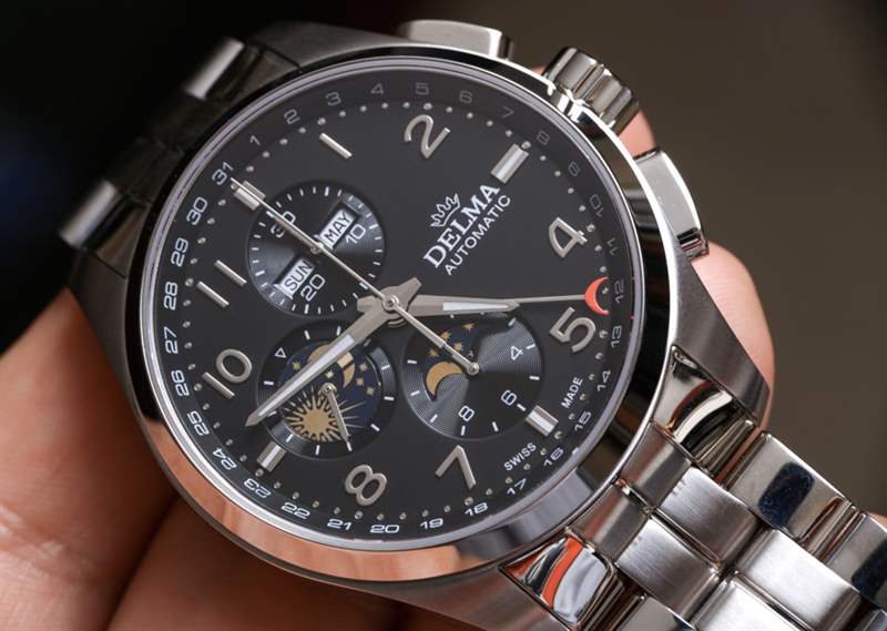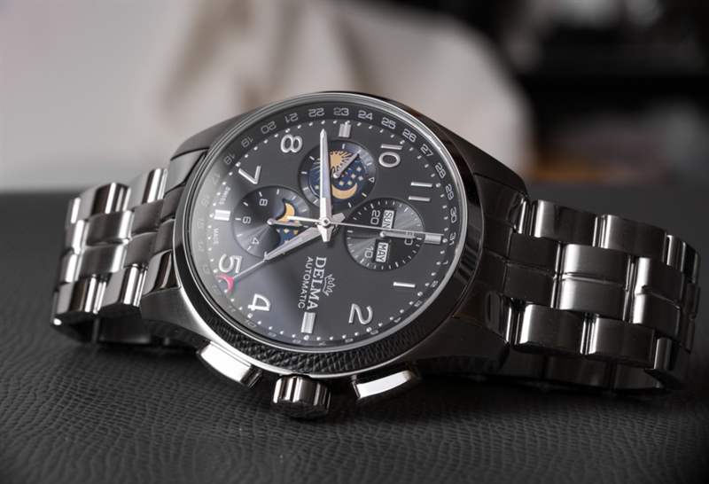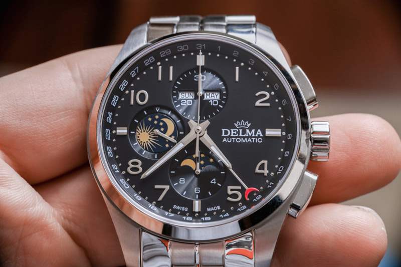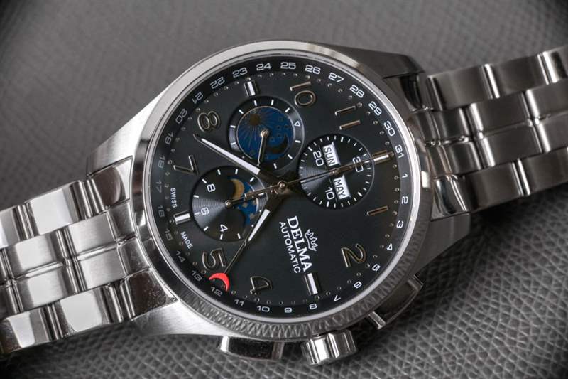 像Delma這樣的手表品牌最適合手表消費者,他們不那么追求大公司的名字,而更多地追求專注于特定形式或風格的產品。這家總部位于瑞士的公司更多的是以優惠的價格提供瑞士手表體驗,而不是嘗試新的設計和美學。這使得大多數 Delma 時計在外觀上都很保守,該品牌可能認為這有助于他們吸引休閑的高端手表愛好者。Delma Klondike Moonphase 是該品牌對這個問題的回答;“我們如何制作帶有 Valjoux 7751 機芯的手表?”?結果是一個設計大雜燴,主要從正裝時計世界中汲取靈感,創造出一款具有大量運動元素的大型手表。