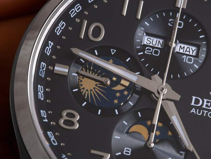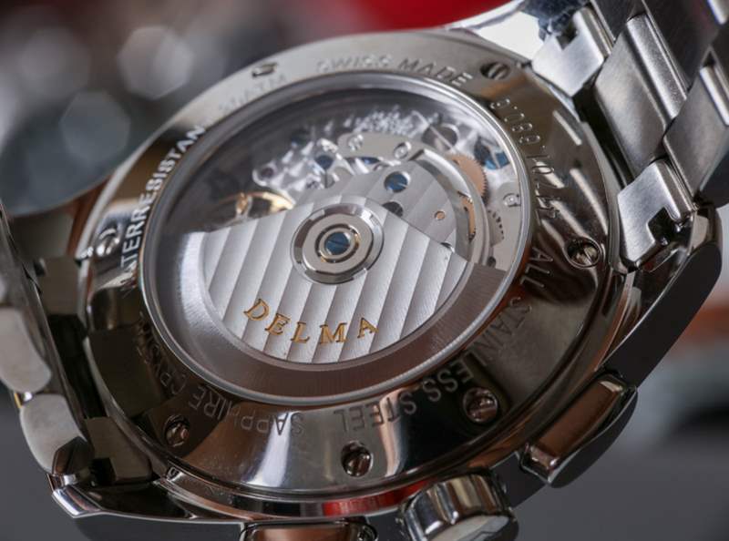 除了用于 24 小時指示器的圓盤外,Delma 盡最大努力生產一款忠實地包含瑞士 ETA Valjoux 7751 自動完整日歷機芯的完整和標準功能的時計。這本質上是一個 Valjoux 7750,但帶有一個添加日歷系統的模塊。表盤上有一個星期和月份的小窗口,整齊地放置在頂部的輔助表盤中,還有一個指針式日期指示器。雖然我有一些基于 Valjoux 7751 的手表并且通常很欣賞它們,但我從來都不是指針式日期的忠實粉絲。我什至不經常看日期,所以讓長手穿過表盤來指示它對我來說真的不值得。7751 是一款物超所值的機芯,唯一真正的缺點是它具有完整的年歷,這意味著您需要每年手動調整更多日歷。沒什么大不了。