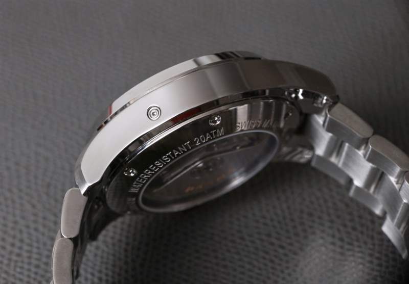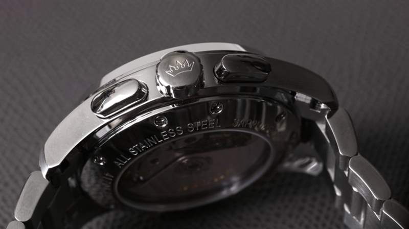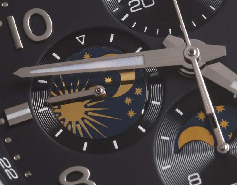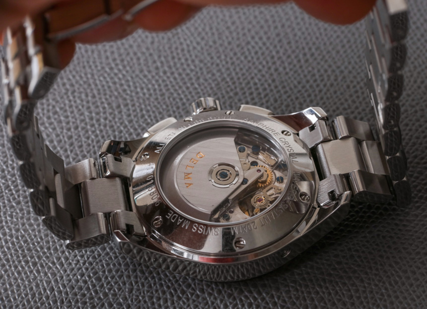 當然,該表保留了12小時計時系統,該系統源自7750部分機芯的淵源。除了表冠和表殼右側的兩個按鈕外,表殼左上方還有一個嵌入式按鈕,它是日歷調節系統的一部分。自動機芯以 4Hz 的頻率運行,動力儲存僅超過兩天。您可以通過藍寶石顯示底蓋查看機芯。