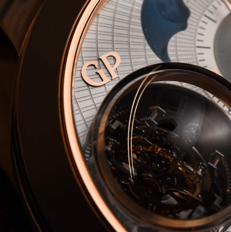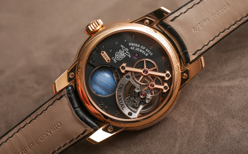 三軸天文館內部的機芯是 GP09310-0001 機芯。手動上鏈,動力儲存 60 小時,工作頻率為 3Hz,由 386 個零件組裝而成。我不認為這個機芯完全是內部制造的,但它可能就像其他由 Girard-Perregaux 設計的復雜陀飛輪手表一樣,由 Greubel Forsey 為它們制造(沒有什么可抱怨的)。在手表的背面,您可以看到帶有標志性 Girard-Perregaux 風格橋板的機芯。