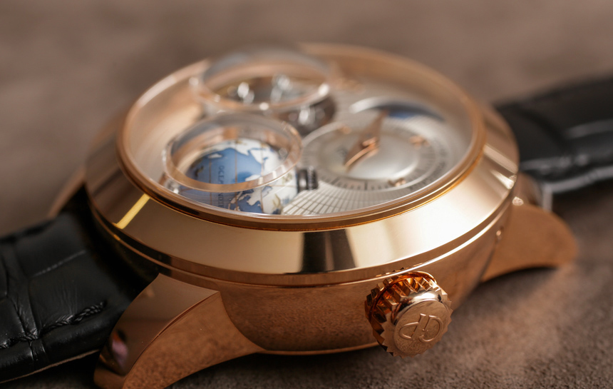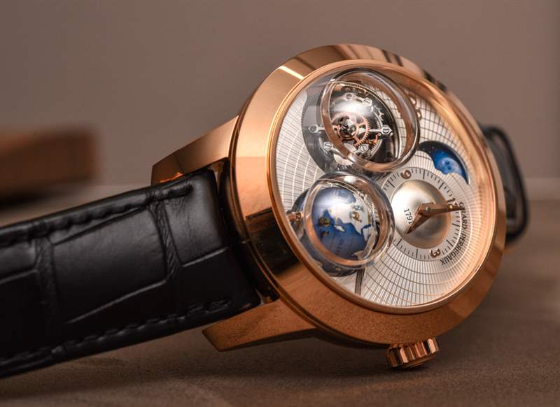 陀飛輪和旋轉的地球儀在表殼頂部都有氣泡——是的,看起來很奇怪。晶體不僅有兩個突起,而且從側面看,它們不是對稱的,甚至大小不一。至少可以說這是一個令人信服的觀點,但并不是每個注意到您復雜的機械豪華手表的人都會知道欣賞這些顛簸。在功能上,三軸天文館(讓我提醒您,這款手表中的任何天文館——假設有一個——實際上并沒有三個軸點)提供時間、通過地球的 24 小時指示器和月相.