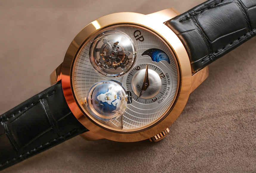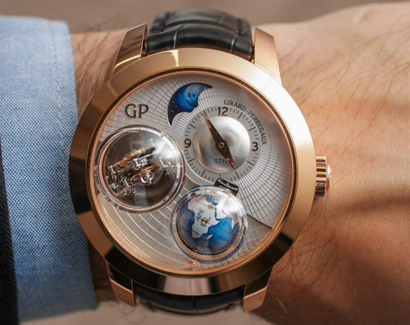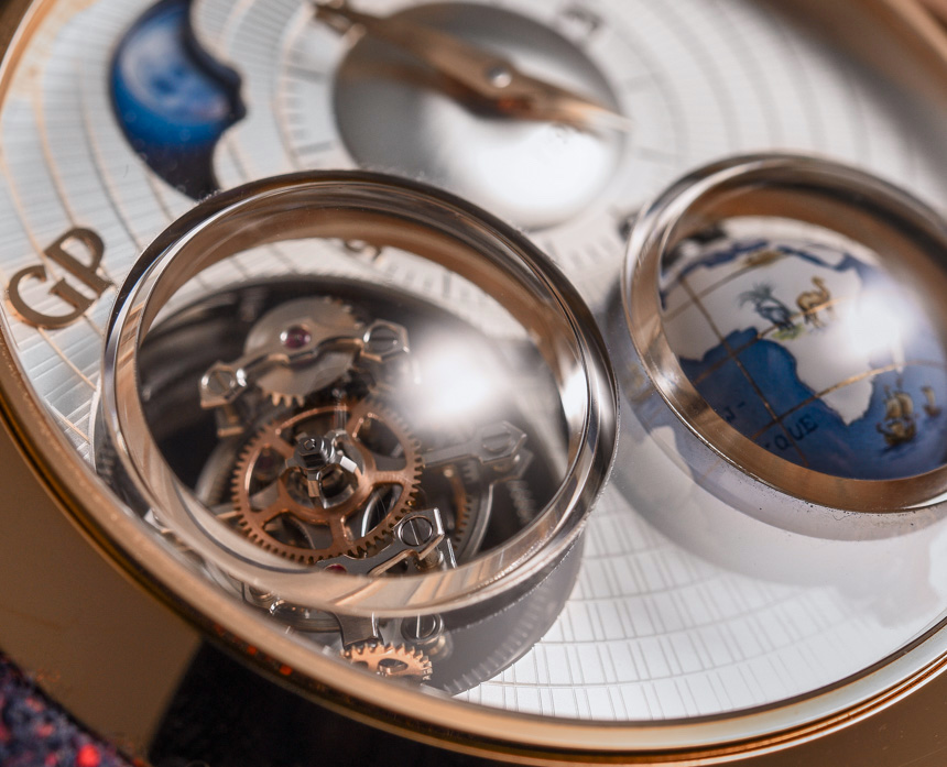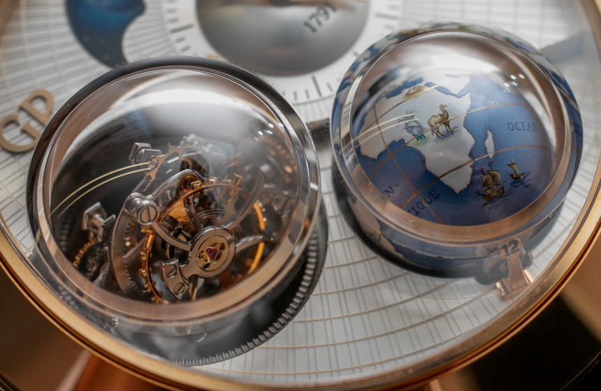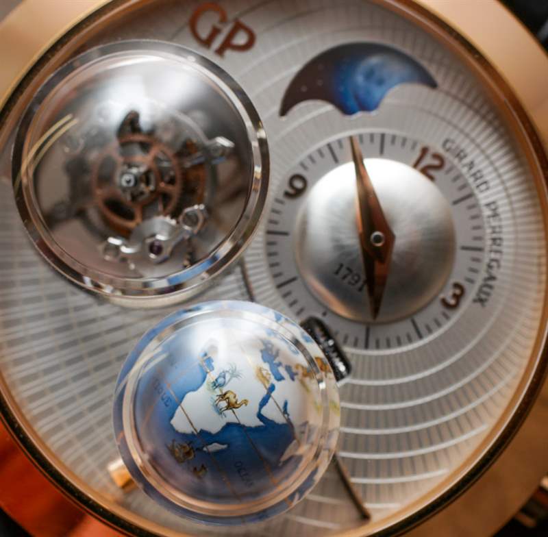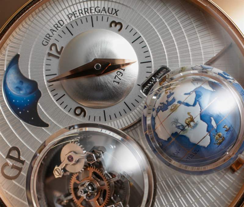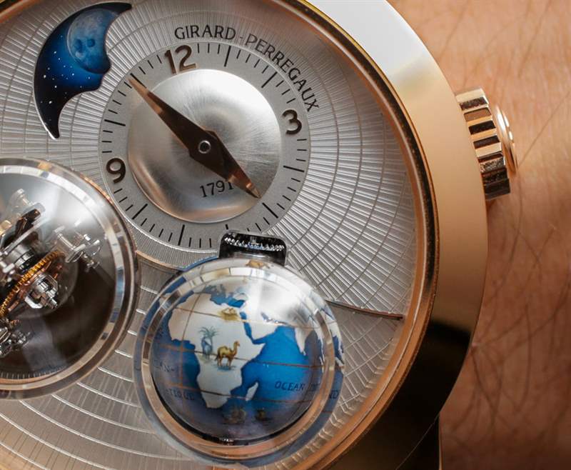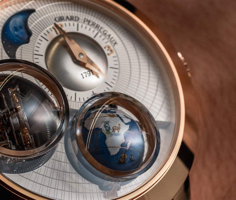 芝柏 ( Girard-Perregaux?) 將這個小型手繪地球儀(大到需要藍寶石水晶中的氣泡)描述為 17 至 18 世紀地圖的縮影。這在制圖界是一個相當大的時間跨度,但我認為即使是品牌也可以同意,當時像 Girard-Perregaux 三軸天文館這樣的時計會讓人感到非常自在。