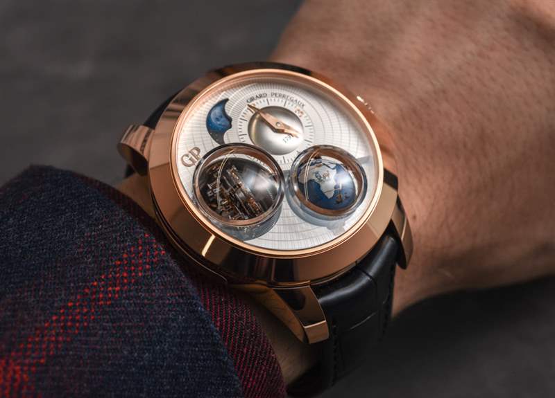 如果 Tri-Axial Planetarium 手表看起來很大,那是因為它有 48 毫米寬和 21.52 毫米厚的圓頂。18k 玫瑰金表殼在手腕上的重量可想而知,這是您在這樣的手表中所期望的。芝柏 (Girard-Perregaux) 盡最大努力保持整體表殼比例經典,因此它在視覺上確實試圖顯得謙虛。廣告訊息廣告信息結束