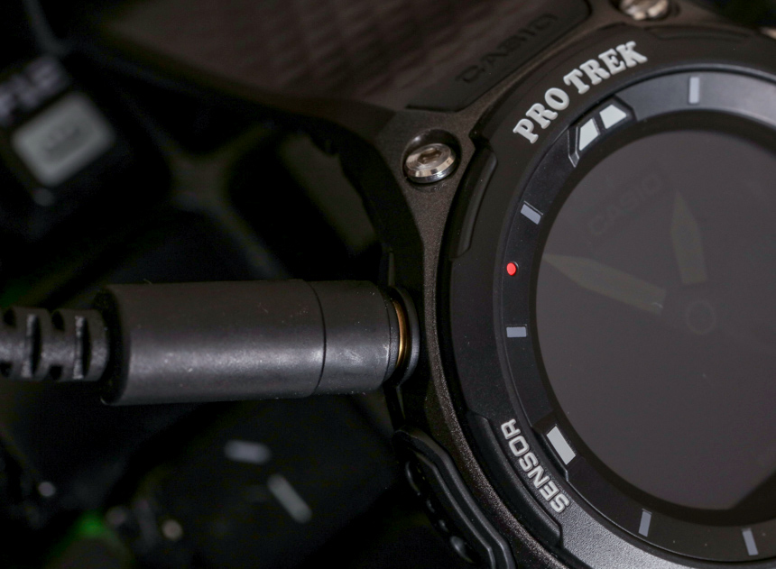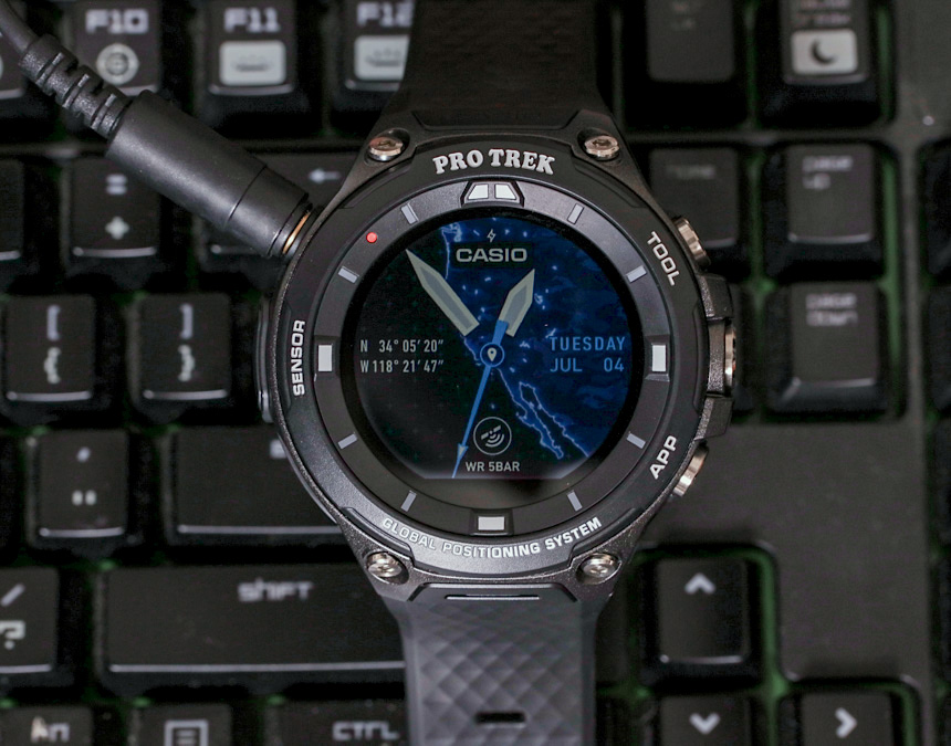 是的,您可以在現場為它們充電,但這并不總是一件容易的事。也許我對 WSD-F20(以及之前的型號)最大的抱怨是卡西歐似乎忽略了這樣一個事實,即人們可能希望在穩定的表面以外的地方為這些設備充電。WSD-F20 的充電速度足夠快(沒有智能手表電池特別大),但為了給它充電,您仍然需要依靠相對脆弱的磁力線。如果您想暫時取下手表并說通過背包或包中的外部電池(如今許多人攜帶)為它充電,該系統根本無法很好地工作。是的,充電線可以工作,