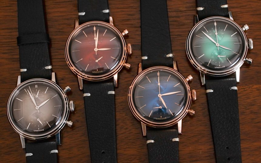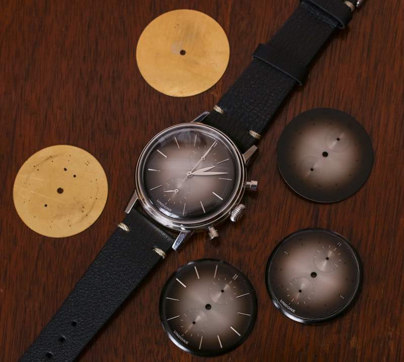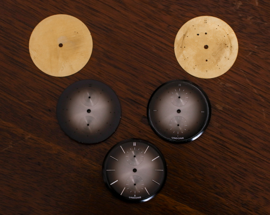 正如您在圖片中看到的,Undone 在五個不同的生產階段分享了一些 Mystique 表盤樣品。你可以看到它是如何從一塊黃銅板開始的,然后在上面印上時標所在的孔,仔細地涂上旭日紋風格的漸變表盤涂漆,墊印有一些指示器,然后添加應用的時標. 這種技術或多或少與高端瑞士手表相同,Undone 似乎不得不提醒收藏家他們為瑞士制造付出了多少。