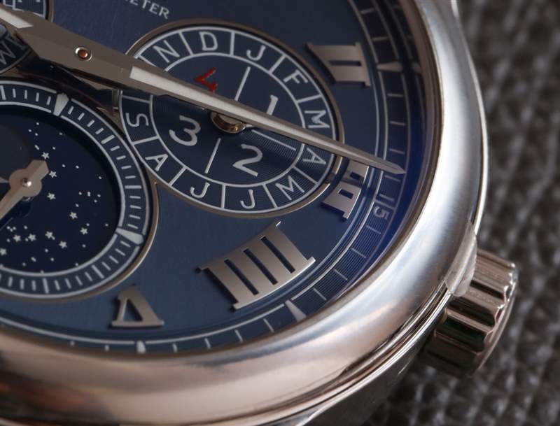 對于最重要的指針,即小時和分鐘指針,易讀性不是問題。時針和分針尺寸完美,進一步受益于夜光材料,與其他表盤元素的光澤色調(diào)形成鮮明對比。