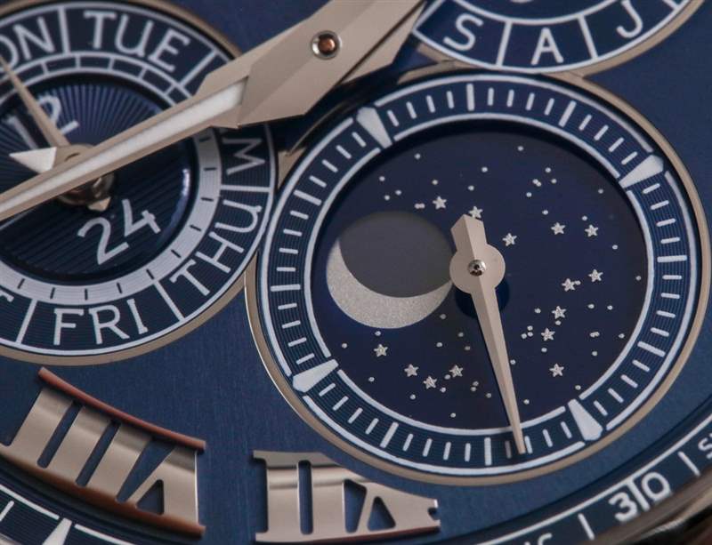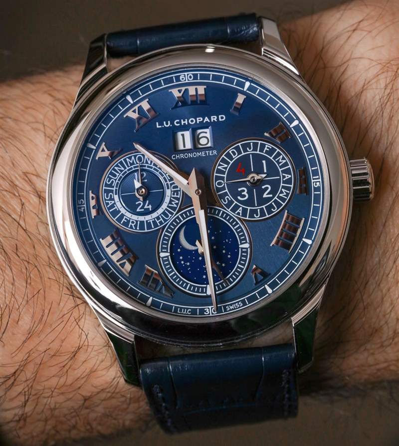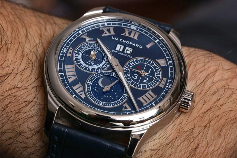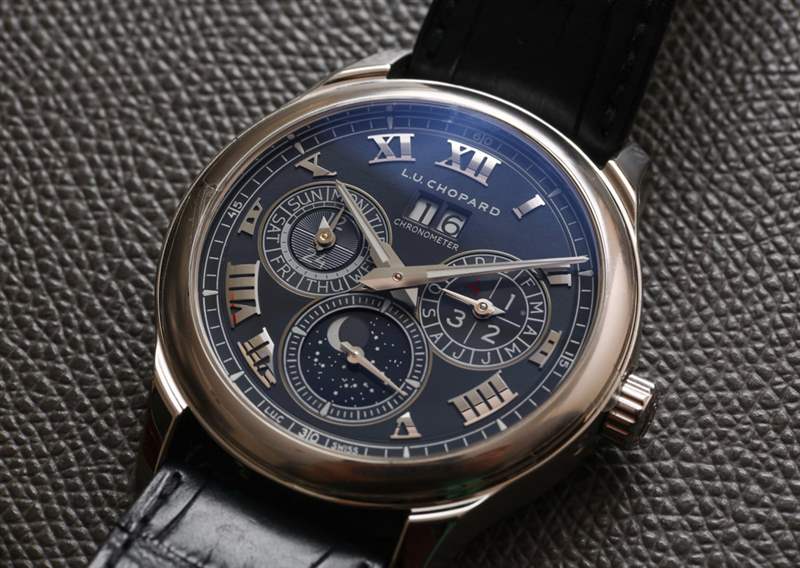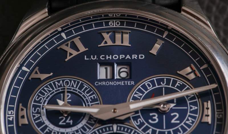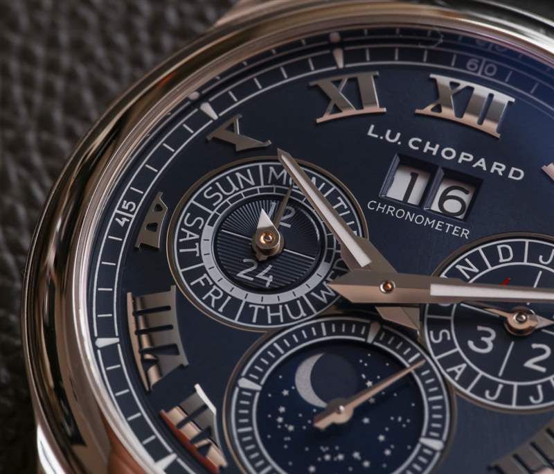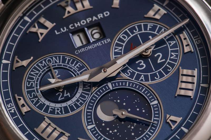 回到對機芯的討論,自動 LUC 96.13-L 以 4Hz(28,800bph)的頻率運行,具有 65 小時的動力儲存,由 355 個零件制成。除時間外,復(fù)雜功能還包括萬年歷和 122 年精確月相指示器。日歷系統(tǒng)顯示日期(通過大日期顯示窗口)、月份、星期幾、閏年和 24 小時(日/夜)指示器。表盤的整體布局是合乎邏輯的,在不覺得過于雜亂的情況下盡可能忙碌。我對表盤的唯一問題是,雖然有些子表盤的指針很容易看到,但其他的則不然。例如,其中兩個子表盤的指針較粗,充滿流明,很容易被發(fā)現(xiàn)。同時,同樣的表盤也有一個更薄、更拋光的指針,這并沒有從對比色中受益。