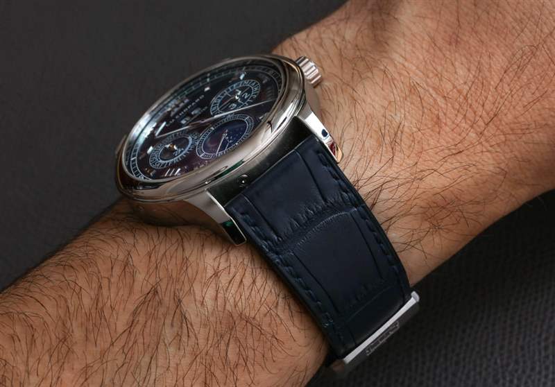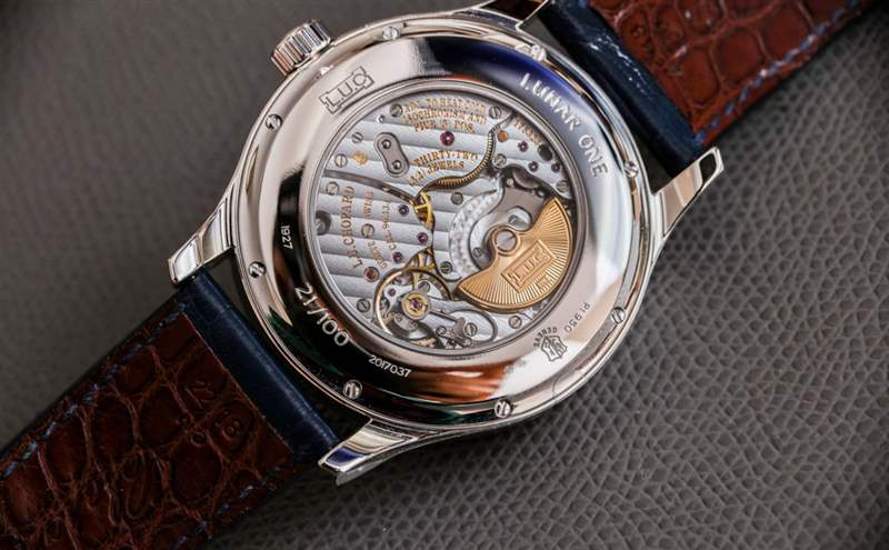 Lunar One 不僅沒有 Perpetual Chrono 表盤上并非所有人都喜歡的副表盤“耳朵”(一種美學的東西),而且還便宜了約 40,000 美元(與鉑金型號相比)。LUC Perpetual Chrono 也是一款更大的手表,表殼寬 45 毫米,而 Lunar One 的表殼尺寸仍然很大(對于正裝表)43 毫米寬。說到尺寸,Lunar One 并不是一只小手表,考慮到寬表耳,對于 43 毫米寬的手表來說,它穿得很大。這不是一件壞事,我知道很多人喜歡這種特殊尺寸的傳統(tǒng)手表。話雖如此,鑒于手表愛好者對他們喜歡的尺寸非常挑剔,如果您對尺寸更適中的正裝手表感興趣,那么在其他地方尋找萬年歷手表(可以說有很多)。
