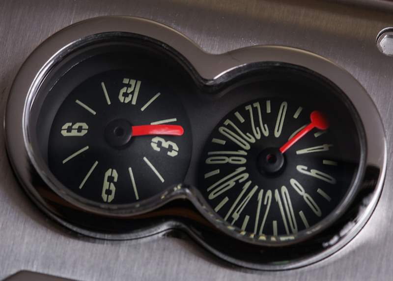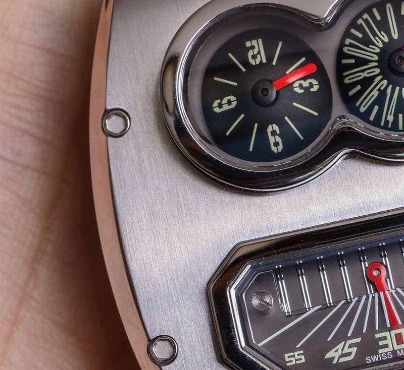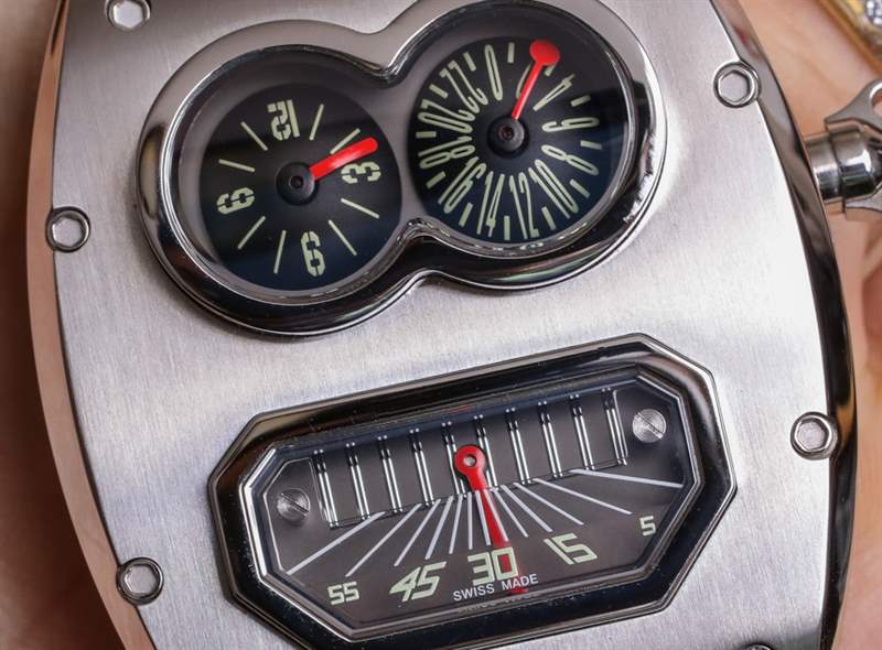 與最初的 Mr. Roboto 手表相比,R2 在許多方面都是升級版。這些手表具有相似的酒桶形表殼和機芯,但表盤設計不同,在我看來,這在 R2 上更令人賞心悅目。其中一項重大升級是用于指示小時和第二時區的半圓頂“眼睛”。非常 MB&F 風格(當然我指的是 HM3 Frog),圓頂有彎曲的手,可以在上面移動。指示分鐘是“嘴”的目的,它使用逆行指針。這個設計讓我想起了模擬汽車收音機,我確信這種相似之處絕非巧合。廣告訊息廣告信息結束