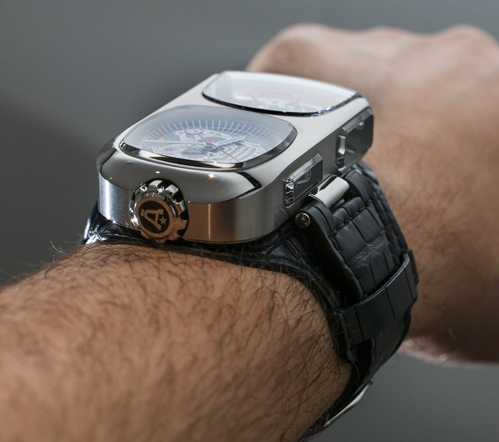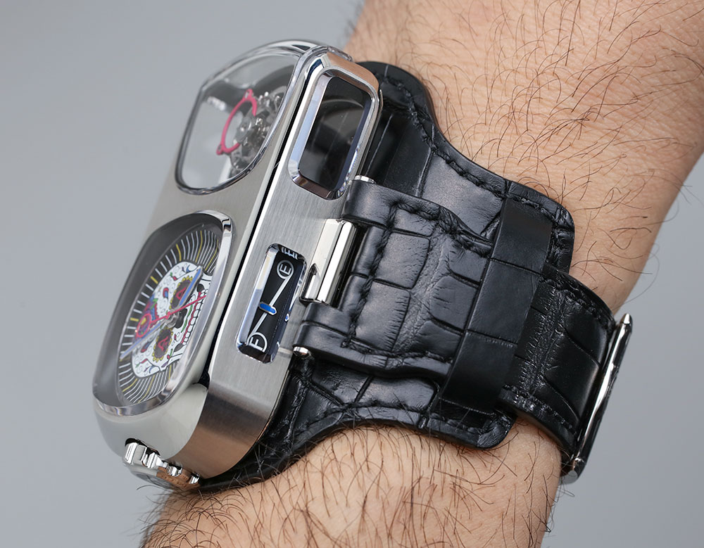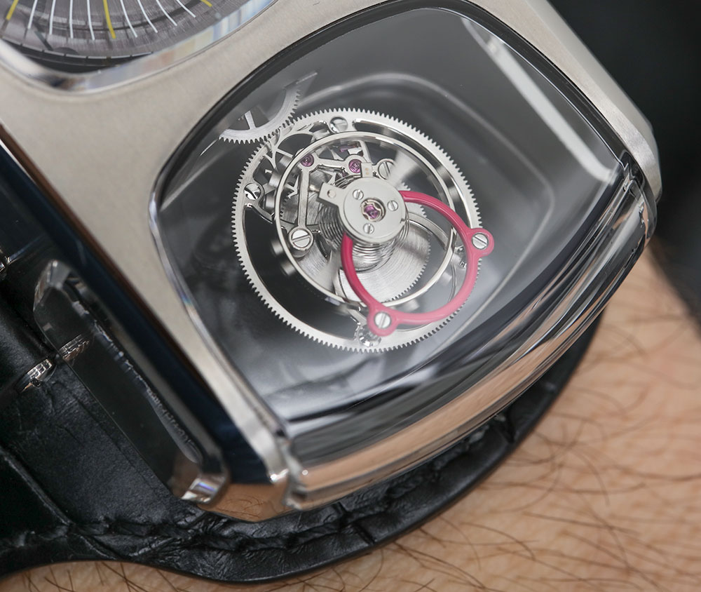 為了與 Calavera 頭骨的紫色、藍(lán)色和綠色相得益彰,飛行陀飛輪組件的一部分被涂成洋紅色。“電動(dòng)剃須刀形”精鋼表殼除了在這些區(qū)域和手表的指示器(指針)上進(jìn)行了彩色處理外,大部分色調(diào)都比較樸素。顏色令人驚嘆,細(xì)節(jié)也是如此。這是一個(gè)奇妙的色調(diào)和線條組合。盡管我認(rèn)為手表的概念非常愚蠢,但我確實(shí)喜歡它戴在手腕上的感覺??ɡS拉萬(wàn)歲!