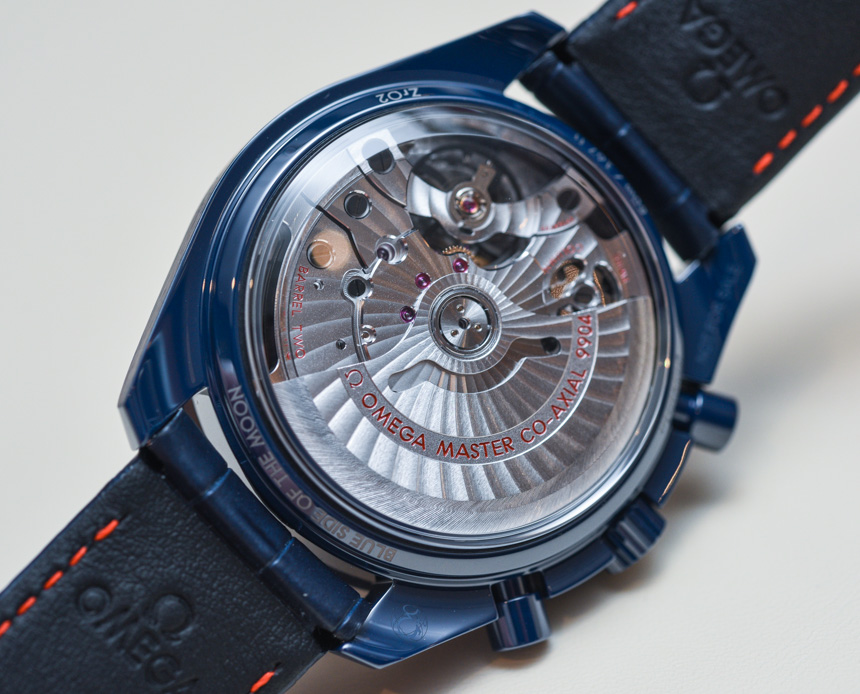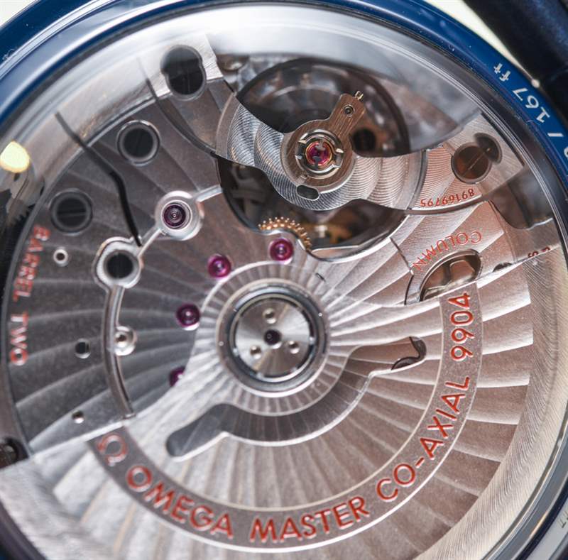 由于我們之前已經(jīng)介紹過(guò)核心的超霸同軸至臻天文臺(tái)計(jì)時(shí)月相腕表,因此我不打算詳細(xì)討論機(jī)芯或腕表的功能。回想一下,9904 型機(jī)芯在計(jì)時(shí)碼表和日期復(fù)雜功能中增加了月相指示器。機(jī)芯表盤(pán)布局的對(duì)稱性令人印象深刻,令人向往。注意每個(gè)子表盤(pán)如何有兩只手。這確實(shí)是迄今為止最有趣和最吸引人的現(xiàn)代歐米茄機(jī)芯之一。當(dāng)然,它具有同軸擒縱系統(tǒng)、METAS 認(rèn)證(以及與之相關(guān)的一切)、4Hz 工作頻率和 60 小時(shí)的動(dòng)力儲(chǔ)備。通過(guò)底蓋的藍(lán)寶石水晶窗可以輕松欣賞到機(jī)芯。