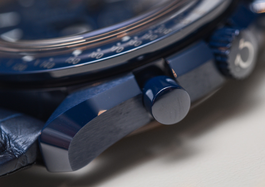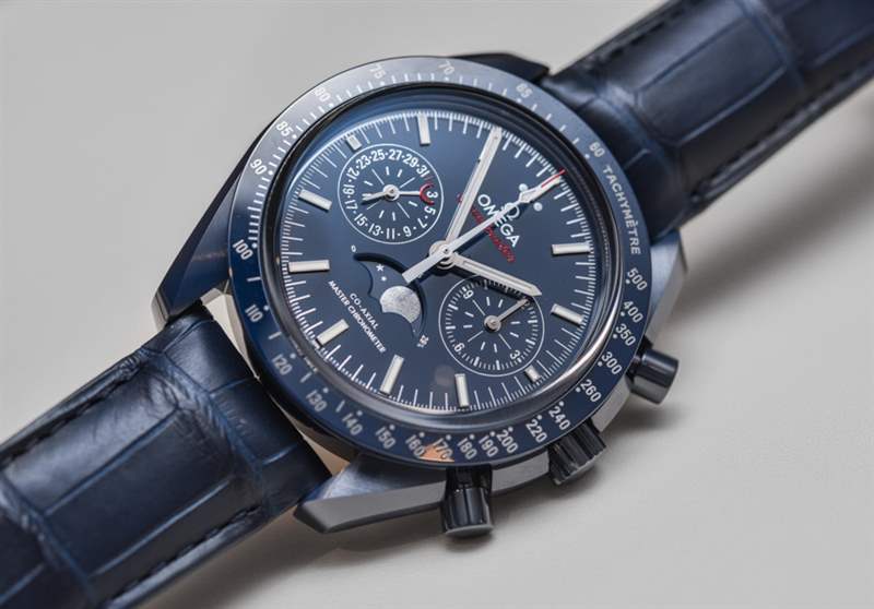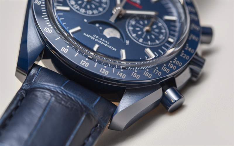 自從最初的 Speedmaster Dark Side Of The Moon(帶有性感的黑色陶瓷表殼)幾年前在 Baselworld 引起轟動(dòng)以來(lái), “月亮的(顏色)面”已經(jīng)成為歐米茄的流行語(yǔ)。歐米茄熱切地嘗試通過(guò)一系列不同的設(shè)計(jì)來(lái)保持彩色陶瓷表殼的趨勢(shì)。甚至 Seamaster Planet Ocean 潛水表也有黑色或藍(lán)色陶瓷表殼可供選擇。歐米茄 Speedmaster Blue Side Of The Moon 是 2017 年最新推出的陶瓷超霸腕表——實(shí)際上也是唯一一款全新的陶瓷腕表。根據(jù)典型的歐米茄慣例,手表的官方(全名)名稱是歐米茄超霸藍(lán)色月球同軸主計(jì)時(shí)計(jì)時(shí)碼表月相。