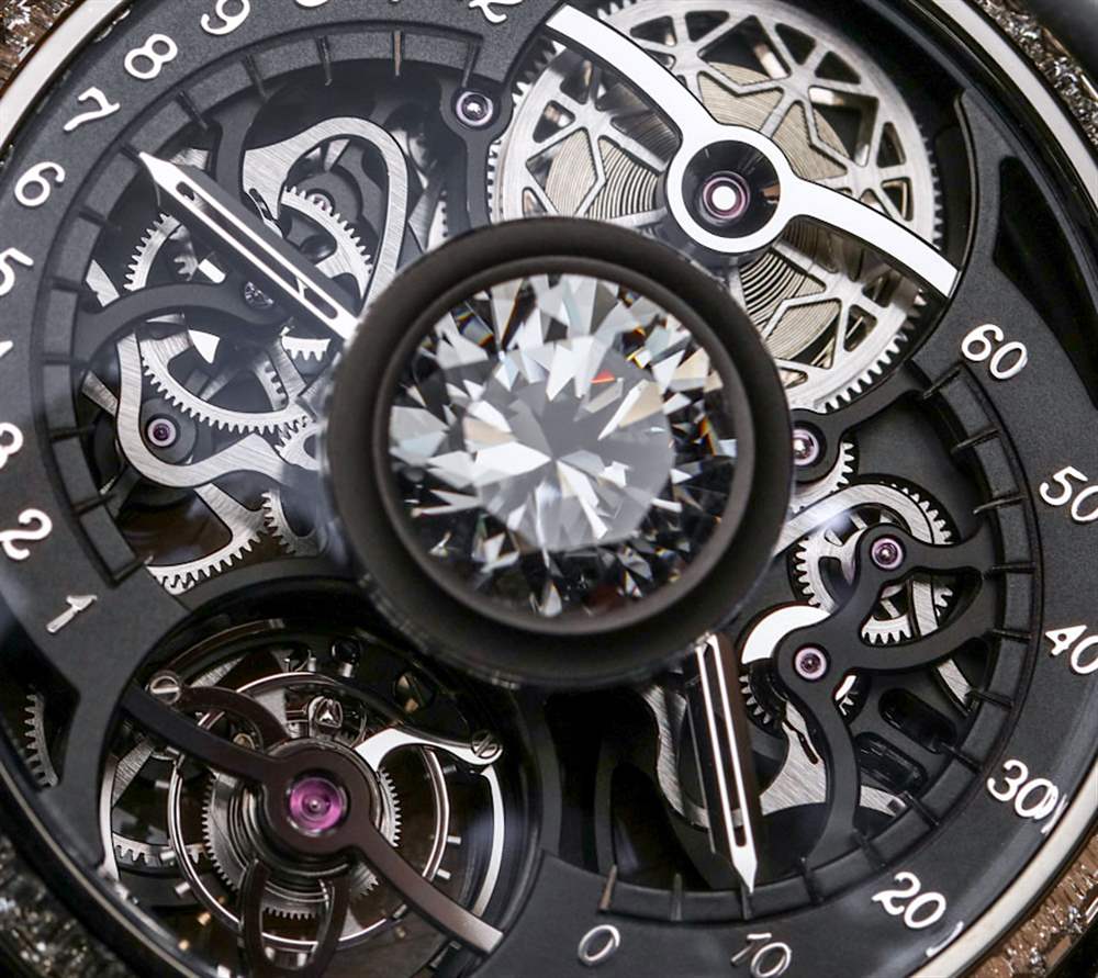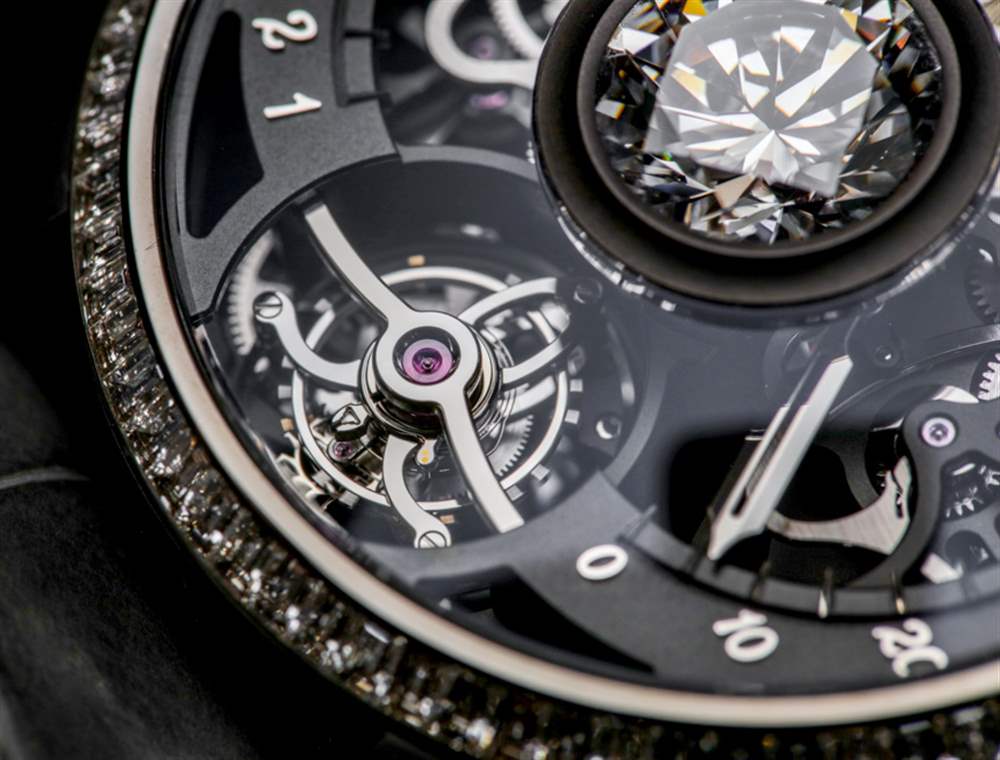 從側面看表殼,看到鉆石的末端粘在表盤上,真的很有趣。它提供了一種非常令人印象深刻的真實感,即在手表中間有一顆大克拉的鉆石。表盤本身當然是圍繞著鉆石安裝在中心這一事實而設計的。De Tournemire 時計的各種版本仍然清晰易讀,但使用不同的顯示時間方式,從標準時針和分針、逆行指針或圓盤到數字指示器。從一開始,您就可以看到該品牌所提供的可愛創意,不僅體現在將鉆石放在設計中的前面和中心(字面意思)的獨特概念中,而且還提供圍繞它的裝飾藝術價值。
