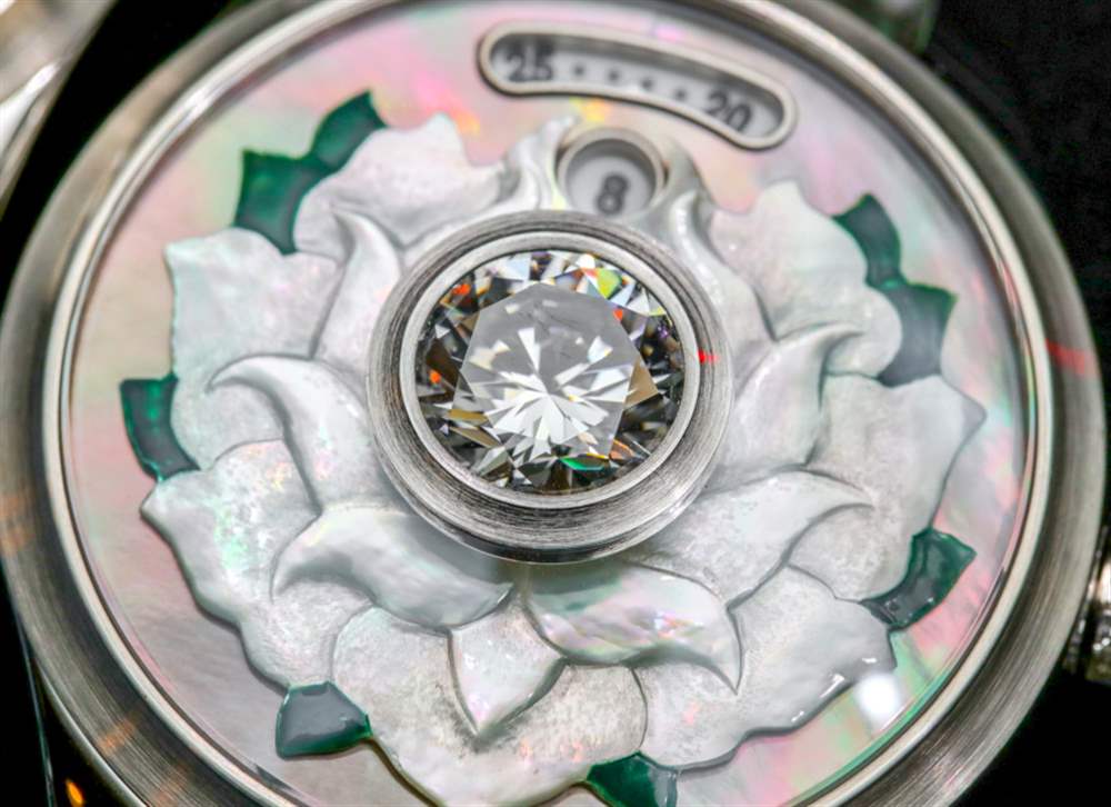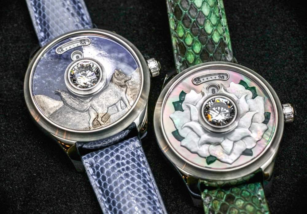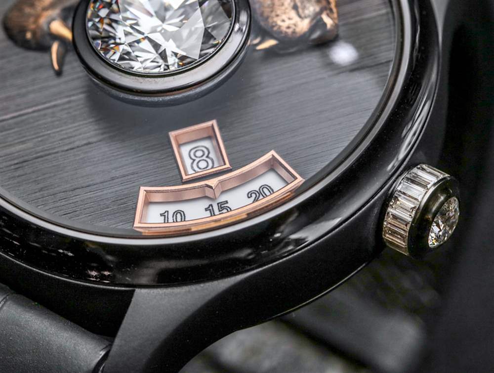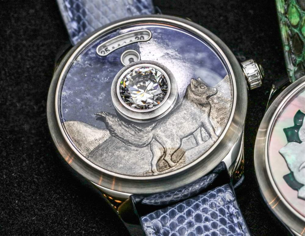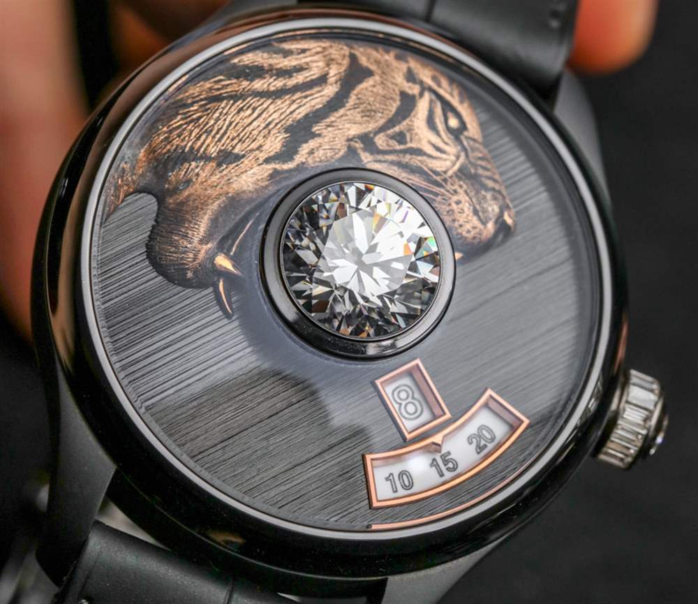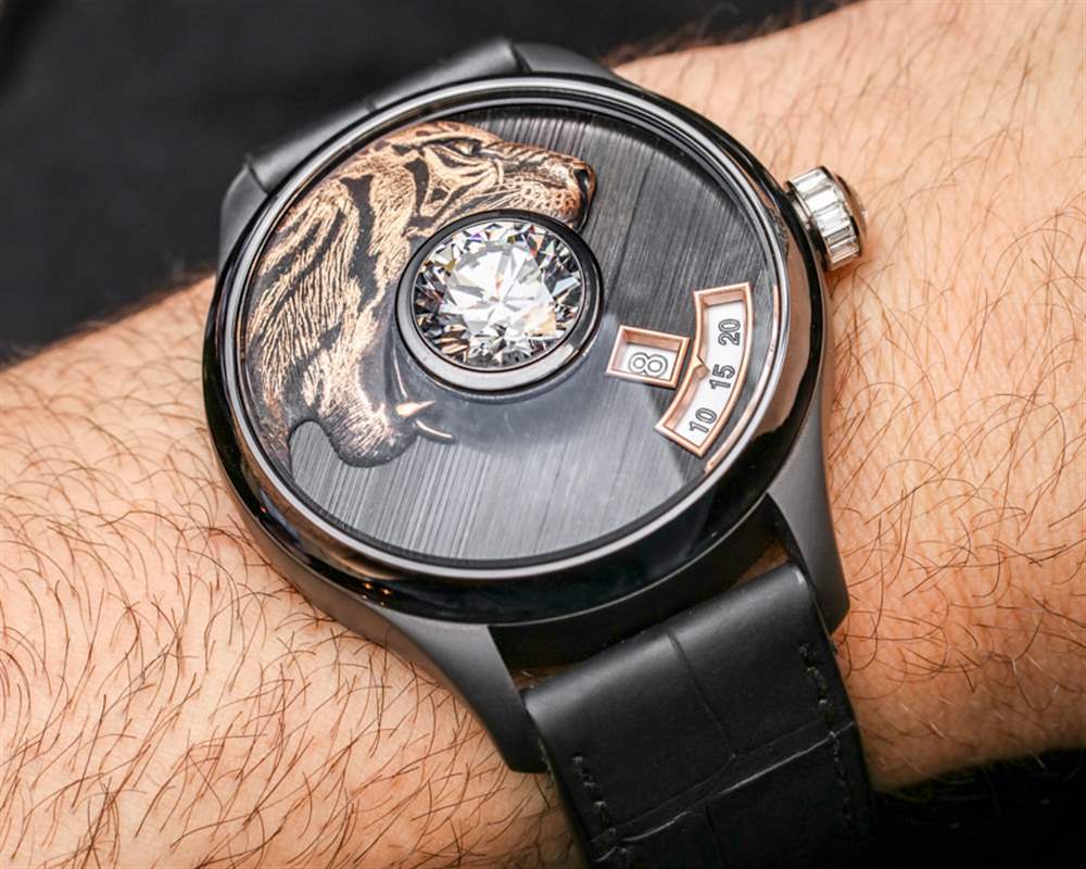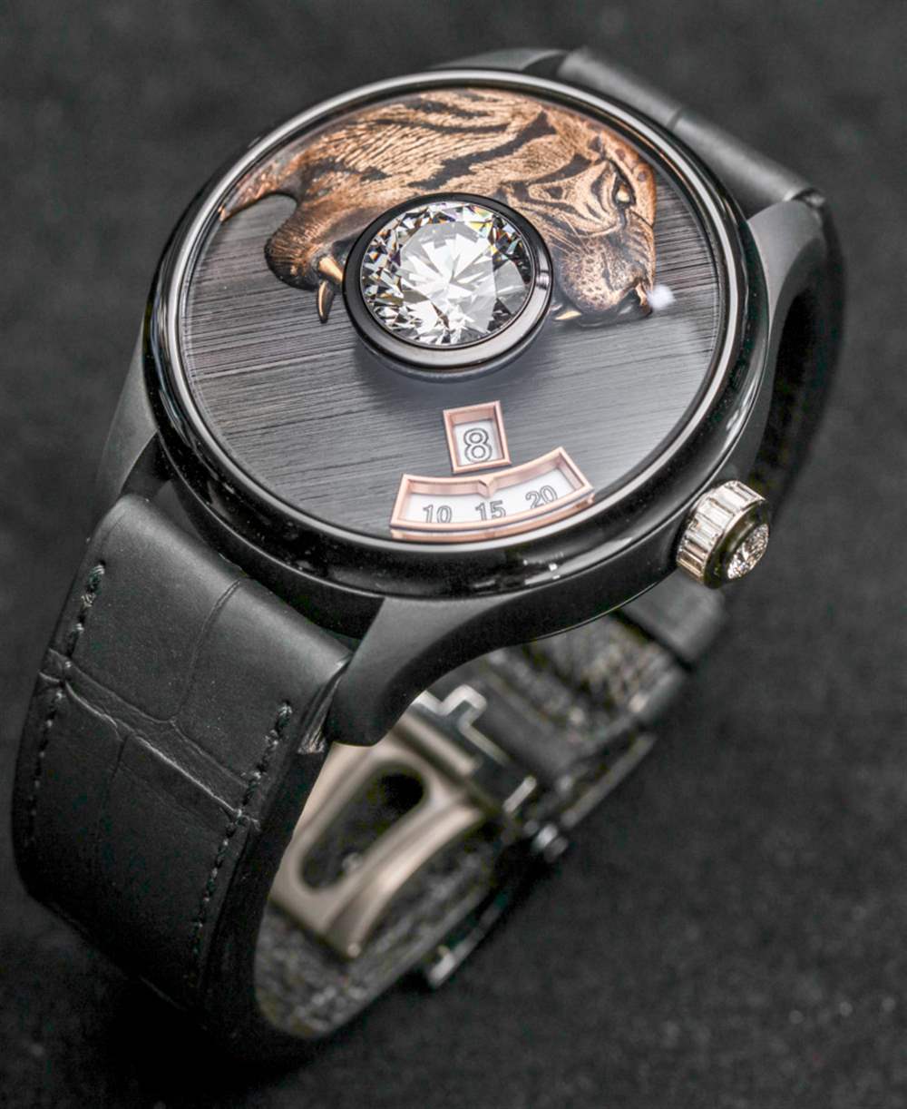 對于 De Tournemire Metiers d’Art Tiger 而言,一個黑色的表殼與一顆 5.05 克拉的鉆石似乎被搭載在由雕刻金和稻草鑲嵌而成的 Tiger 的下顎中。時間顯示在兩個窗口中(取決于手表的表盤,可以放置在任何地方)小時或分鐘。手表內部是瑞士自動機械機芯。這件作品顯然很奢華,但也展示了一種健康的幽默感和真實的個性,在某些方面幾乎淡化了它對過度的公然描繪。