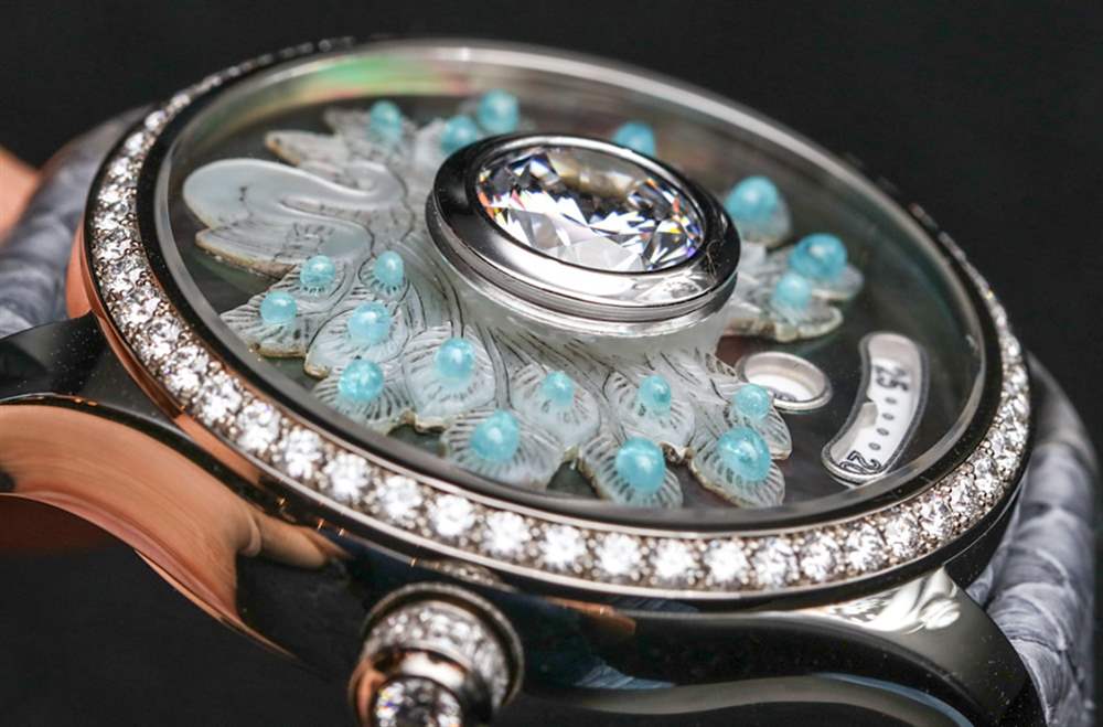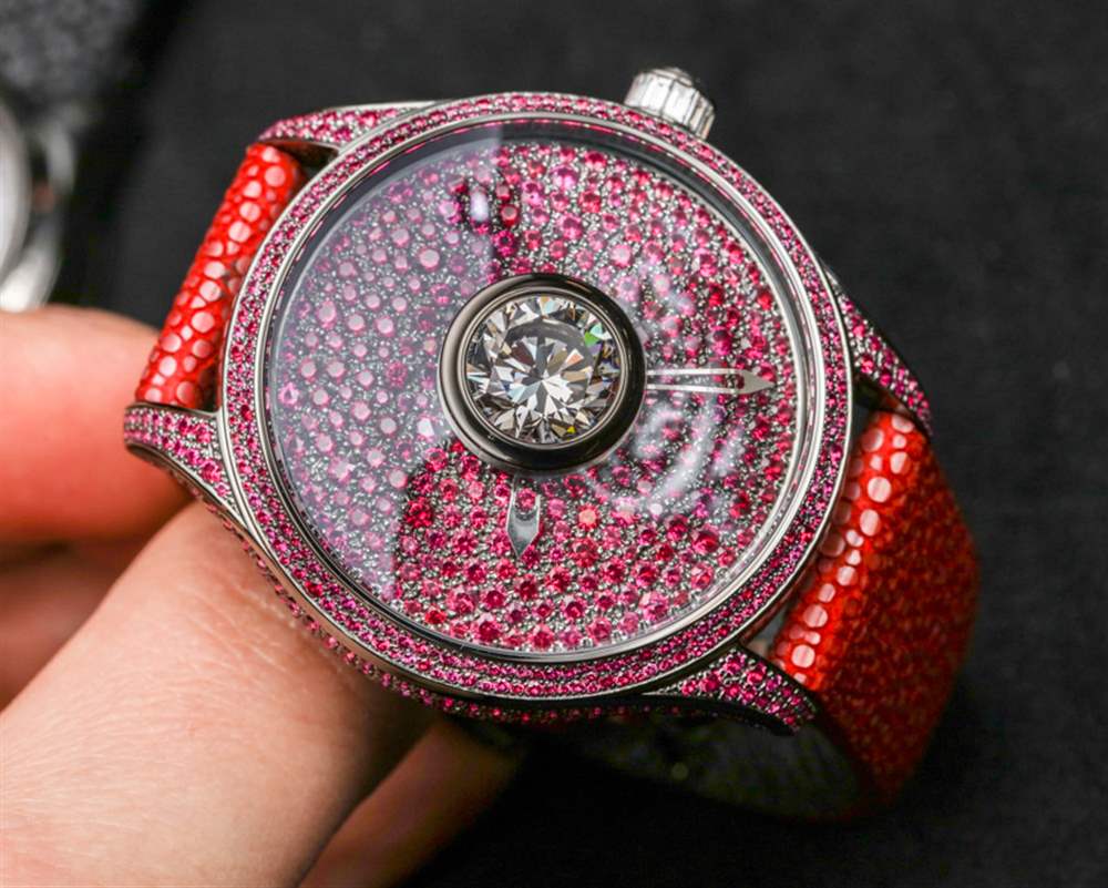 De Tournemire 系列手表中最傳統的(如果你想這么稱呼它的話)是 Abyss 系列。在這里,標準時針和分針放置在鑲鉆或其他裝飾性表盤上,藍寶石水晶表鏡中心也安裝了一顆大鉆石。我說“傳統”是考慮到內部的兩手自動機械機芯,以及表殼的整體珠寶般的外觀,這在本質上更加保守。盡管如此,它仍明確定位于前衛的高奢品類。