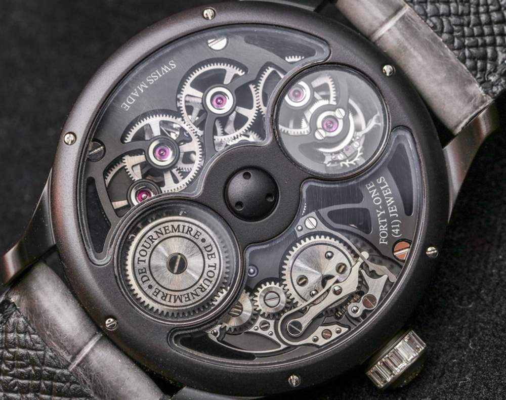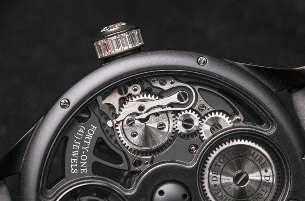 該品牌 2017 年的旗艦產品是 De Tournemire 陀飛輪,它有幾個版本,具體取決于您對鑲有鉆石的鉆石的喜愛程度。44.8 毫米寬的表殼采用多種材料制成,例如 DLC 涂層鈦或黃金等貴金屬。考慮到機芯,表殼很厚,但手腕上雖然優雅,但舒適且相對簡單。最簡單的表殼沒有鉆石裝飾——除了表冠外圍的長方形切割鉆石。