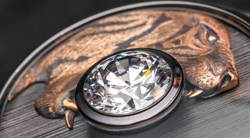 除了 De Tournemire Tourbillon 型號之外,De Tournemire Metiers d’Art 腕表在表盤上采用了一系列藝術技術,從雕刻到繪畫,以及其他旨在吸引男性或女性的工藝作品。女款表款的表殼尺寸更小,只有 40 毫米寬,并且通常配備比例較小的約 3 克拉鉆石。De Tournemire Tiger 是我特別喜歡的一款,它很好地展示了該品牌的優勢。