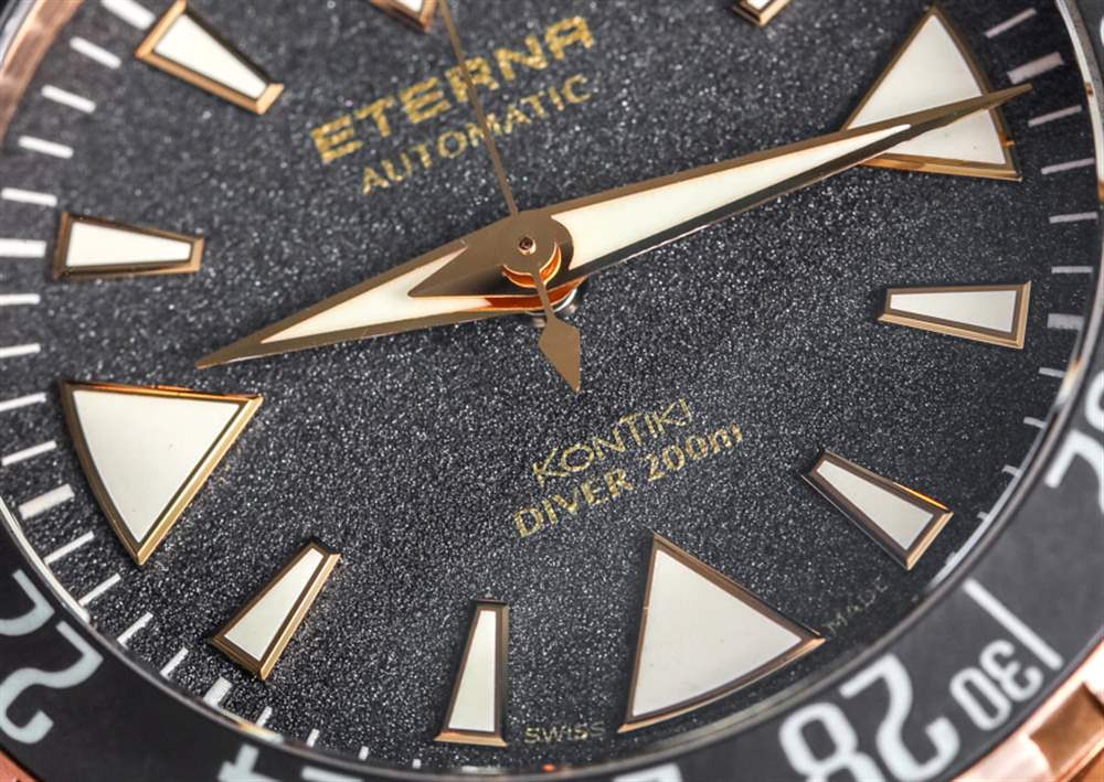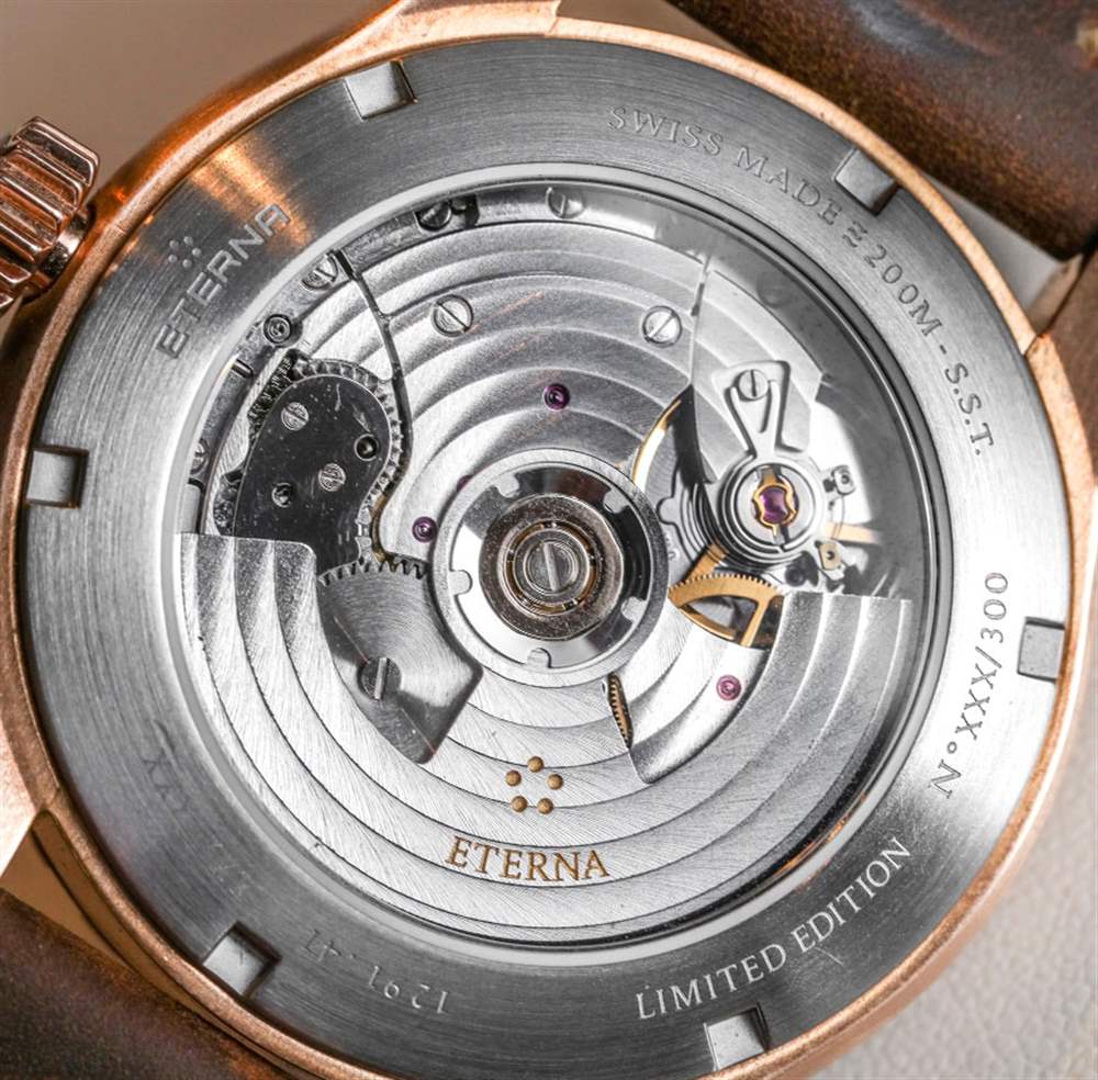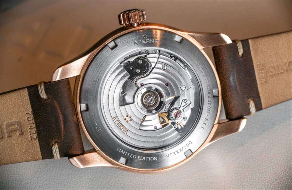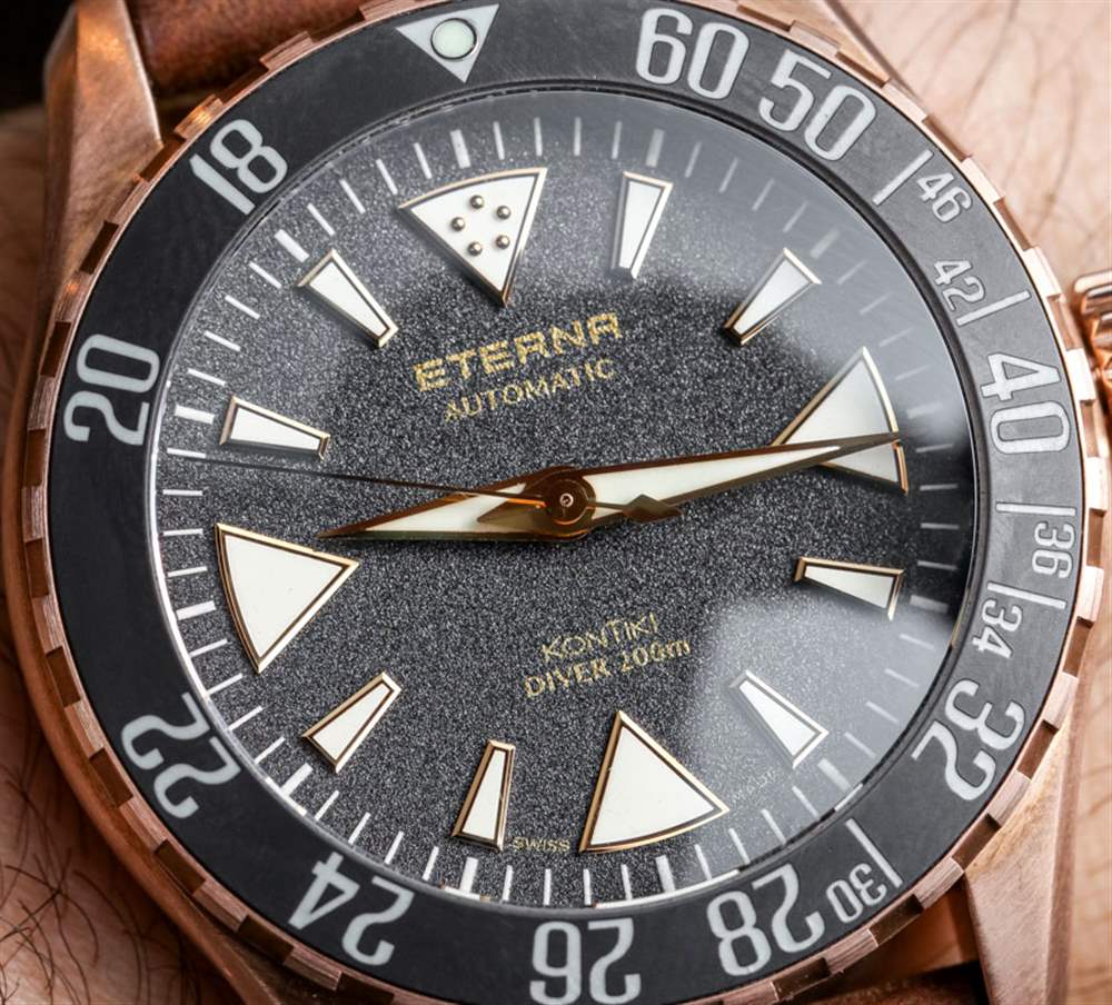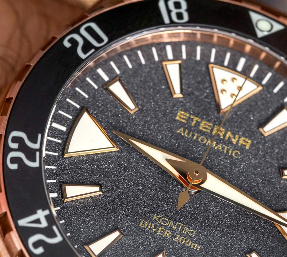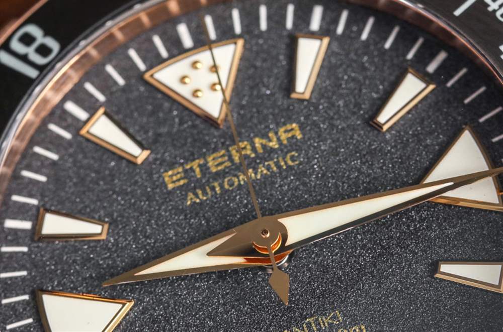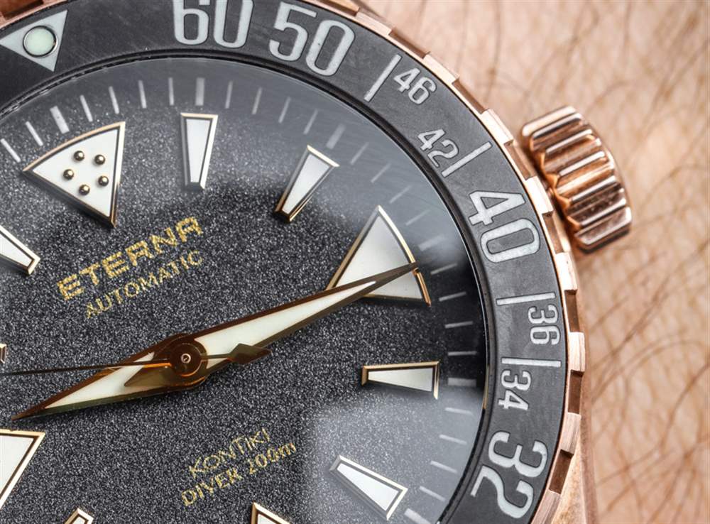 青銅表殼(鋼底蓋)寬 44 毫米,防水深度達 200 米。我應該注意到它有一個展覽底蓋,可以看到機芯——這在標題中帶有“制造”的手表中很重要,這意味著機芯是內部制造的。Eterna KonTiki Manufacture Bronze 的厚度為 14.5 毫米,給人一種不錯的質感,考慮到機芯的厚度,這款手表實際上比 2017 年新款鋼殼 Eterna KonTiki Diver Gent 更厚。后者更薄,厚度為 12.2 毫米,這意味著 KonTiki Manufacture Bronze 型號的厚度為 2.3 毫米。兩者都防水200米。