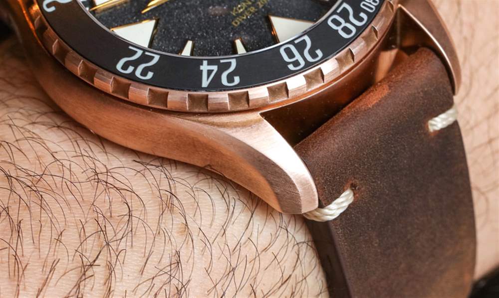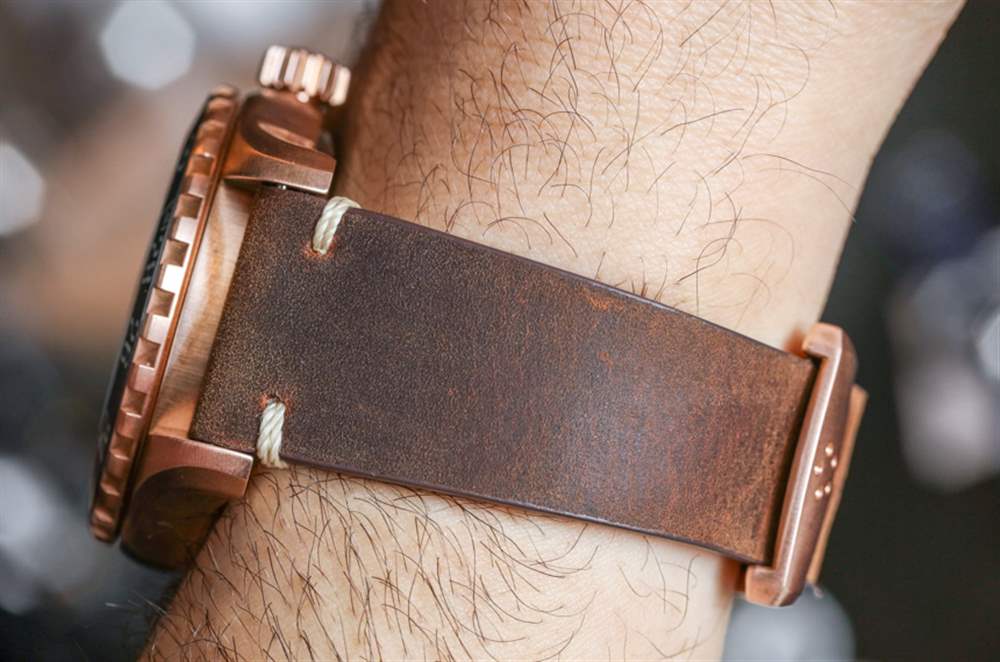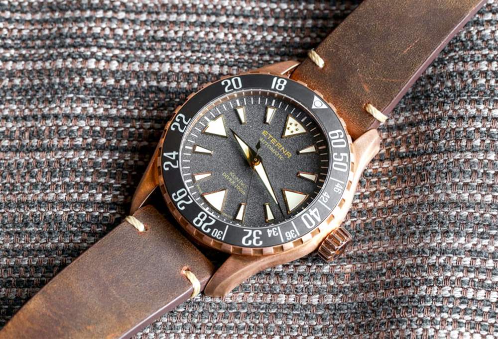 在我愛上潛水表的風格之前,我必須首先愛上它的易讀性和舒適性——這兩者都在 Eterna KonTiki Manufacture Bronze 中獲得了贊譽。這是一款帥氣的、經典主題的潛水表,采用現代皮膚和時尚外觀。即使是表帶也是時尚的,它的棕色皮革款式看起來很老舊(在匹配的青銅扣上)。然而,Eterna 提醒我們,它也經過特殊處理以防水 – 以確保這是一款真正的潛水表。我不確定 Eterna 是否包含額外的表帶,但橡膠表帶(用于更嚴重的水中使用)可能會很好地作為這件作品的配件。