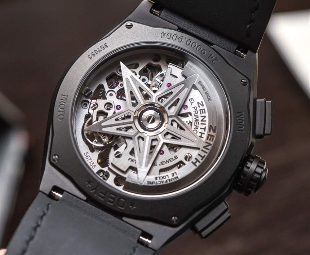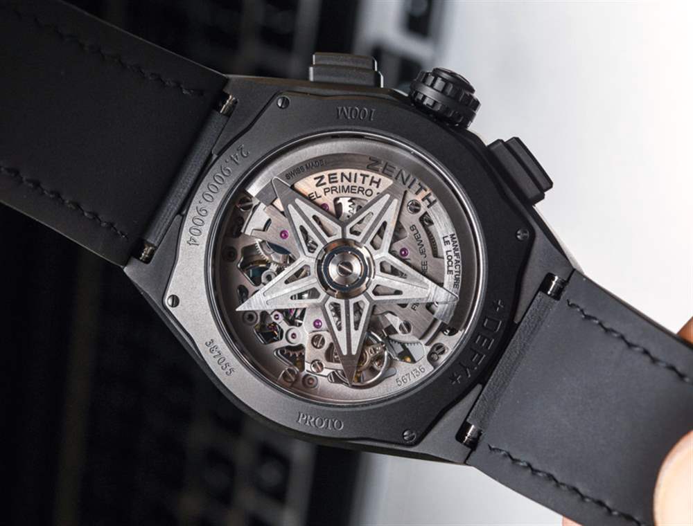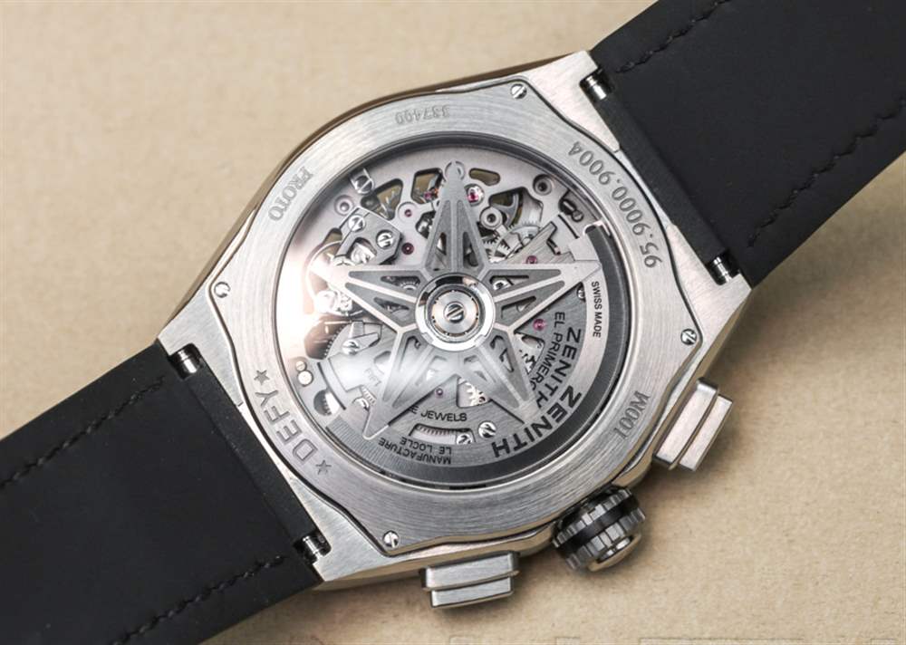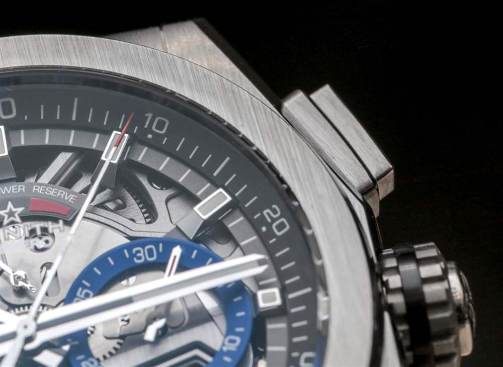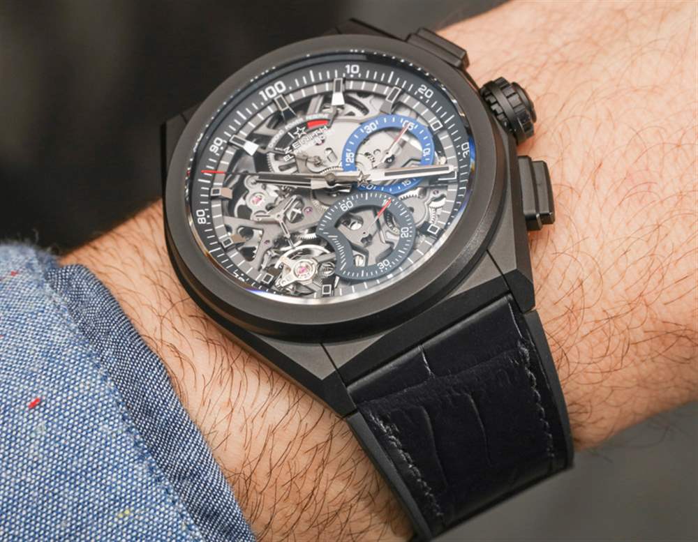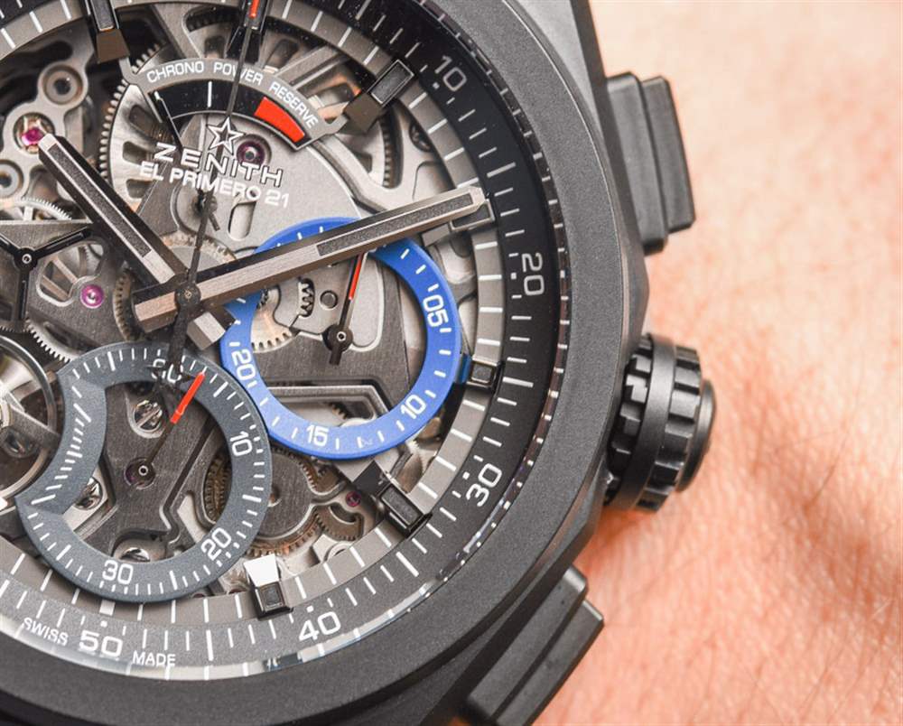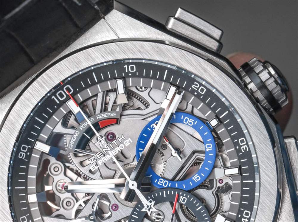 當我推出 Zenith Defy El Primero 21 時,我解釋說 Zenith 將首先發(fā)布三個版本。我不認為我會像開放式表盤那樣喜歡實心表盤版本……但我確實喜歡。44 毫米寬的鈦金屬或黑色陶瓷(不要與圓形尺寸混淆!)鋁制表殼既舒適又美觀。表殼厚度為 14.5 毫米,防水深度達 100 米,采用平坦的 AR 涂層藍寶石水晶鏡面)。它可能沒有宇舶大爆炸那樣的直接吸引力,但話又說回來,它并沒有試圖成為一個。事實上,這款表殼在手腕上看起來非常優(yōu)雅,最突出的特點是略顯不成比例的大矩形計時碼表按鈕——考慮到這款手表完全是關于計時碼表的,這可能是一個有目的的設計決定。