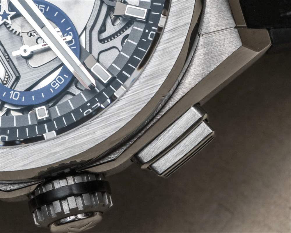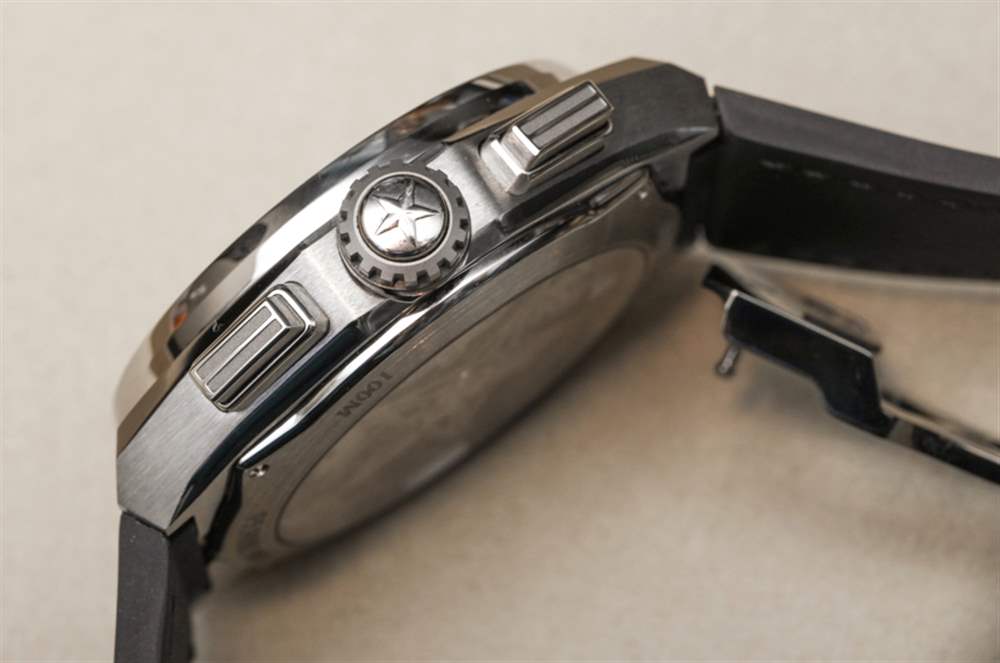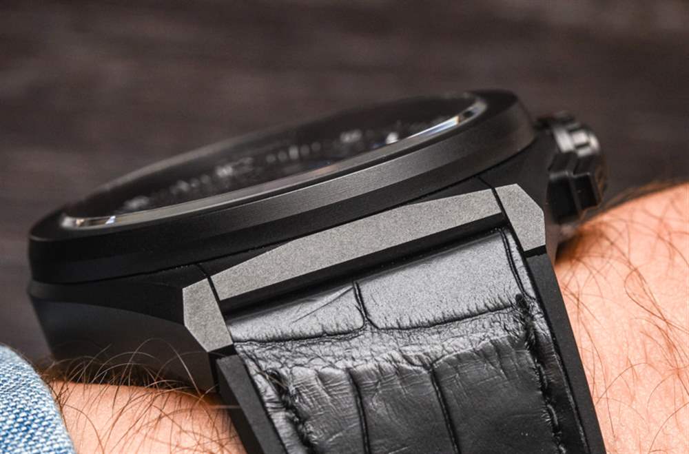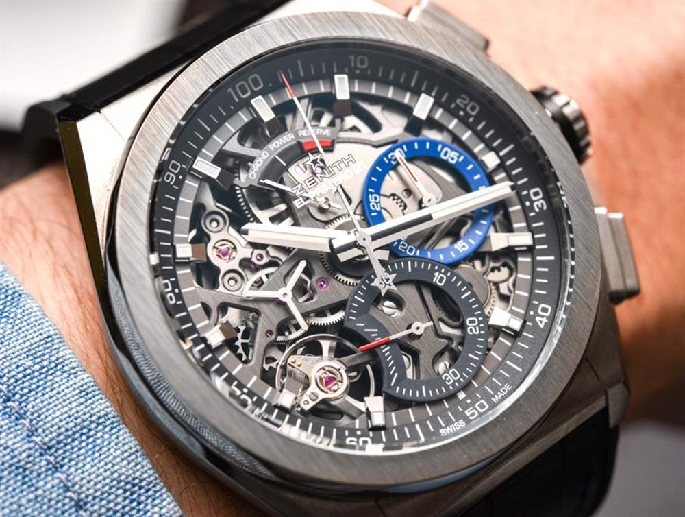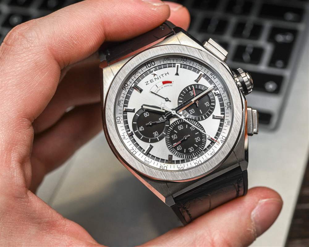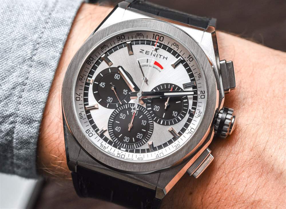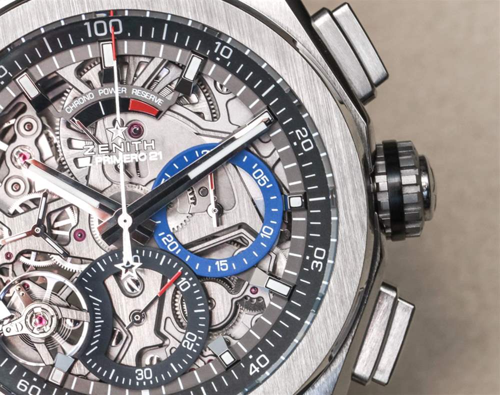 當我推出 Zenith Defy El Primero 21 時,我解釋說 Zenith 將首先發(fā)布三個版本。我不認為我會像開放式表盤那樣喜歡實心表盤版本……但我確實喜歡。44 毫米寬的鈦金屬或黑色陶瓷(不要與圓形尺寸混淆!)鋁制表殼既舒適又美觀。表殼厚度為 14.5 毫米,防水深度達 100 米,采用平坦的 AR 涂層藍寶石水晶鏡面)。它可能沒有宇舶大爆炸那樣的直接吸引力,但話又說回來,它并沒有試圖成為一個。事實上,這款表殼在手腕上看起來非常優(yōu)雅,最突出的特點是略顯不成比例的大矩形計時碼表按鈕——考慮到這款手表完全是關于計時碼表的,這可能是一個有目的的設計決定。