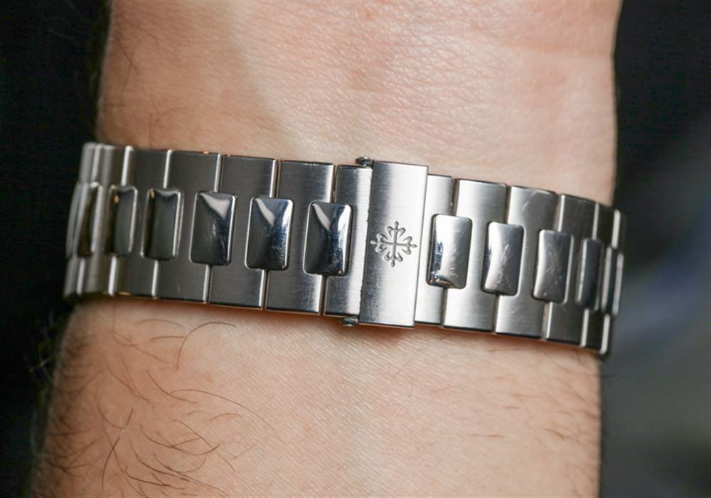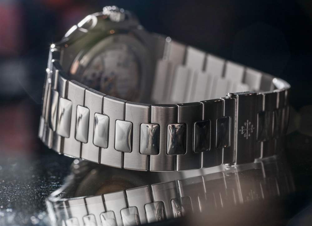 百達(dá)翡麗 Nautilus 5711/1P 也比大多數(shù) Nautilus 手表大,寬度為 44.05 毫米。它不會(huì)穿得太大,因?yàn)檫@種尺寸的很大一部分歸功于大側(cè)面 – 這是原始 Gerald Genta 設(shè)計(jì)的標(biāo)志。逐漸變細(xì)的鉑金手鏈既貼合手腕又非常舒適。有了這個(gè)尺寸和整體可愛的美感,這可能是我穿過的最喜歡的 Nautilus ——但當(dāng)然,你需要忍受鉑金的價(jià)格。在 120 米處,與其他 Nautilus 型號(hào)相比,防水性能保持不變。