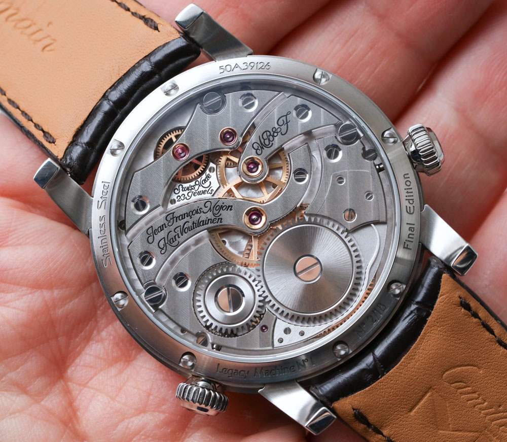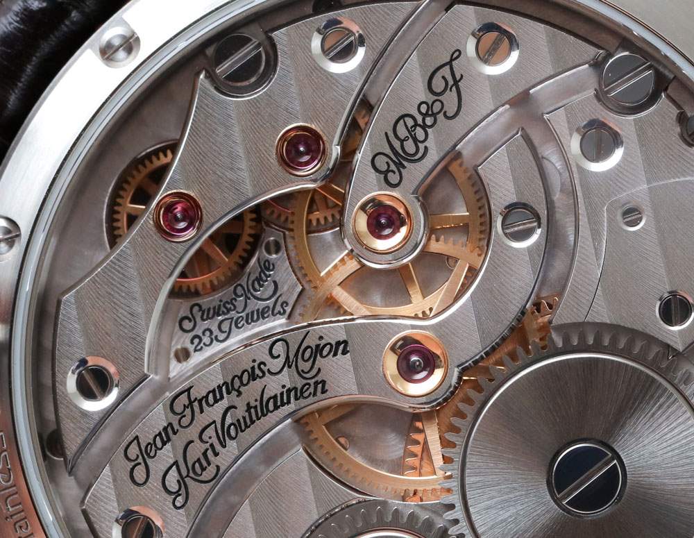 LM1 表殼再次為 44 毫米寬 x 16 毫米厚(由于顯著的圓頂藍(lán)寶石水晶)。它佩戴起來(lái)非常舒適,并包含專為 MB&F 生產(chǎn)的極其性感的手動(dòng)上鏈機(jī)械機(jī)芯。該機(jī)芯在 Kari Voutilainen 的工作室完成,最初由 Jean-Francois Mojon 設(shè)計(jì)。該機(jī)芯由 279 個(gè)零件制成,運(yùn)行頻率為 2.5Hz(18,000bph),動(dòng)力儲(chǔ)存為 45 小時(shí)。相對(duì)較慢的擺輪頻率是故意的,以便用戶可以通過表盤更好地查看調(diào)節(jié)機(jī)構(gòu)的動(dòng)畫,因?yàn)閿[輪突出顯示在面部的橋上。