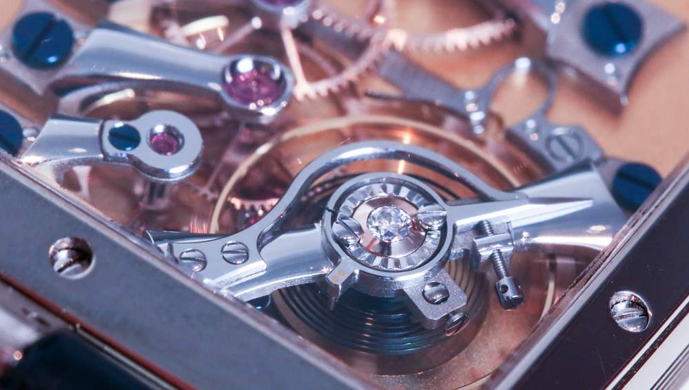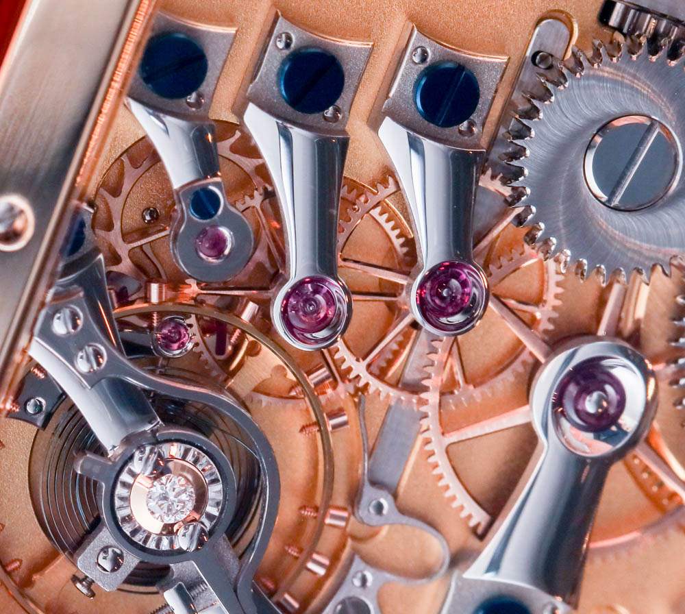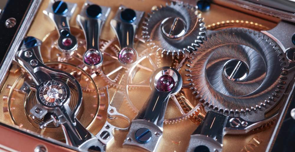 磨砂黃銅色調的主夾板用作各種手工制作鋼橋的畫布。這是一種不常見的觸感,因為橋梁通常不是鋼制的。表橋的圓形邊緣很寬,鏡面拋光的圓潤頂部。然后,您可以在各種組件上進行仔細的斜切邊緣,以補充齒輪上美麗的蝸形飾面。所有的螺絲都經過火焰藍處理和手工拋光,而齒輪和其他一些部件則是各種色調的純金。