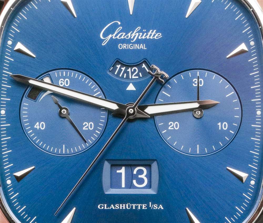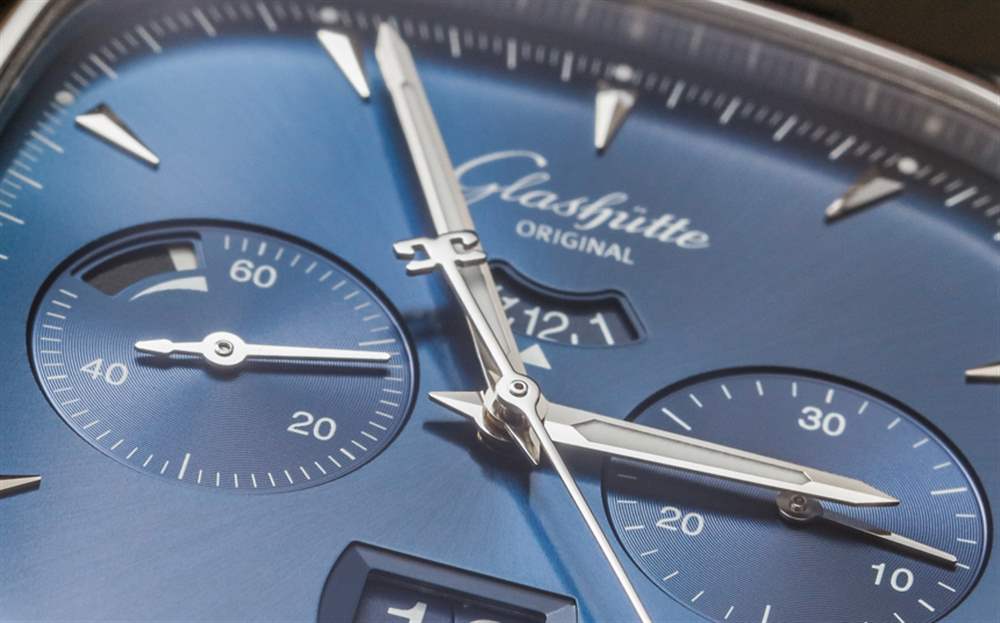 由于所有手表都因其表盤而被出售或淘汰,讓我們暫時(shí)討論一下這款 70 年代計(jì)時(shí)碼表上的手表。這個(gè)版本是旭日形金屬藍(lán),由格拉蘇蒂原創(chuàng)由他們自己的表盤制造商生產(chǎn),該制造商位于德國普福爾茨海姆的該國其他地方。藍(lán)色不僅是化學(xué)應(yīng)用的,而且是使用精心設(shè)計(jì)的技術(shù)使用清漆層完成的。藍(lán)色是當(dāng)今手表表盤的流行選擇,這是一件好事,因?yàn)樗峁┝吮然疑说念伾?,并且比黑色、白色或銀色更友好一些。話雖如此,制作一個(gè)好的藍(lán)色表盤的挑戰(zhàn)在于獲得正確的色調(diào)和修飾。太亮或太暗,很容易破壞吸引力;太啞光,看起來很便宜;太有光澤,會(huì)影響易讀性。