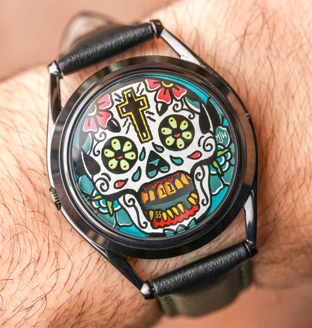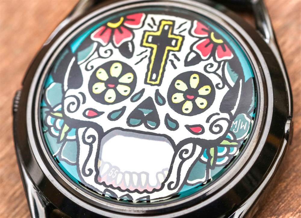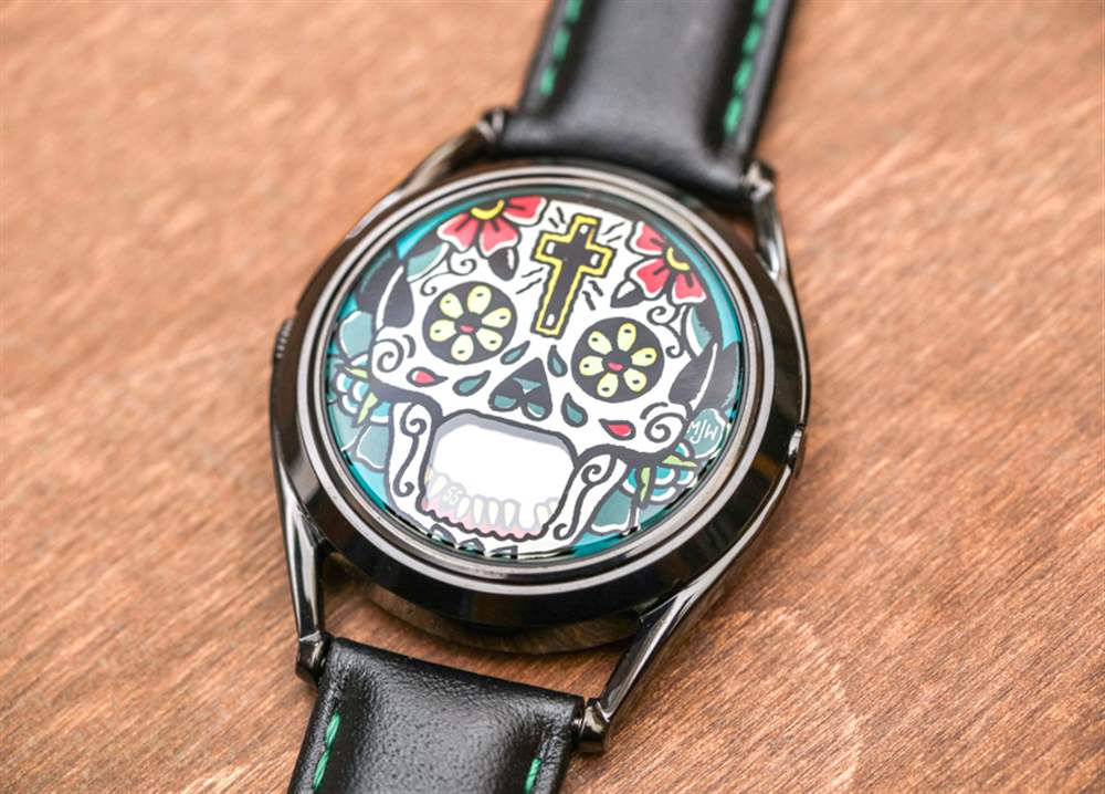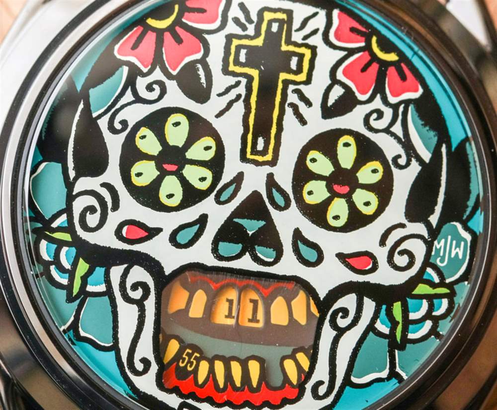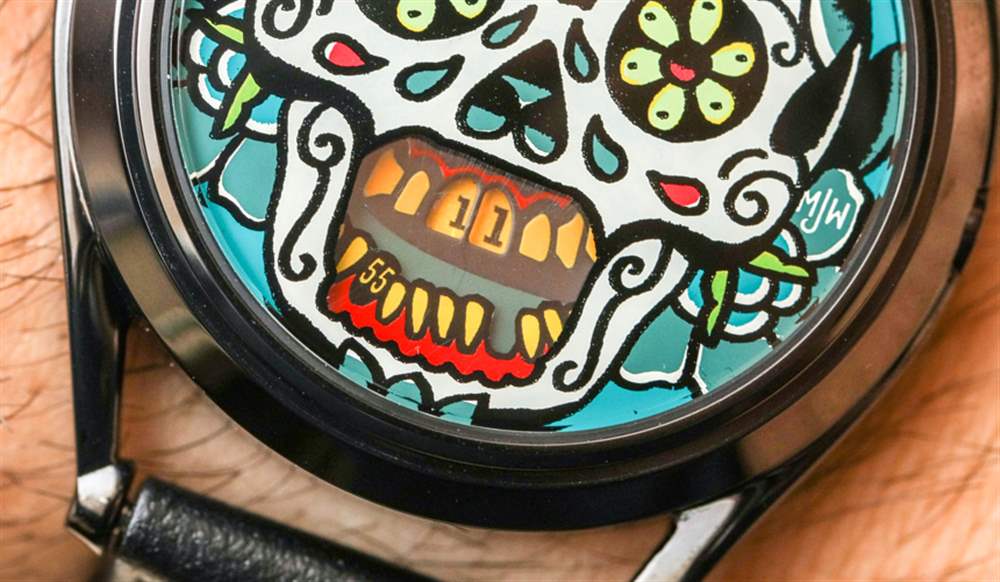 MJW 在 The Accurate 之后推出了更多圖形——但同樣構思——Mr. Jones Last Laugh 手表系列,該系列已經發展成幾個不同的版本。在這篇評論中,您可以看到 Last Laugh Tattoo,它采用表盤概念上的骷髏頭,并以色彩繽紛的墨西哥亡靈節為主題。兩個旋轉以指示時間的圓盤顯示為頭骨的牙齒。同樣,它并不是要成為易讀性的縮影,而是作為一種藝術表達,盡管如此,它仍能告訴時間。對一些人來說,死亡的提醒是一種威脅,顯然,對另一些人來說,這是一個賦予他們力量的概念,提醒他們我們每個人都面臨著同樣的命運,所以生活就是你做什么,而你有能力做某事。