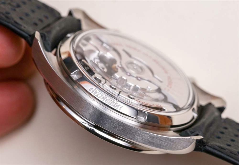 通過現在更圓潤的藍寶石水晶底蓋可以看到 9900 系列自動機芯。它以 4 赫茲(28,800 次/小時)的頻率運行,高于之前一些同軸擒縱 Omega 機芯的 3.5 赫茲。擒縱系統采用硅游絲,兩個主發條盒之間的動力儲存為 60 小時。該機芯具有帶小秒盤的時間,以及一個完整的 12 小時計時碼表,計時碼表分針和時針位于同一個(右)子表盤中。6點鐘有日期。該機芯既獲得了 METAS 認證,也獲得了 COSC 天文臺認證,盡管前者的認證使后者或多或少顯得多余。