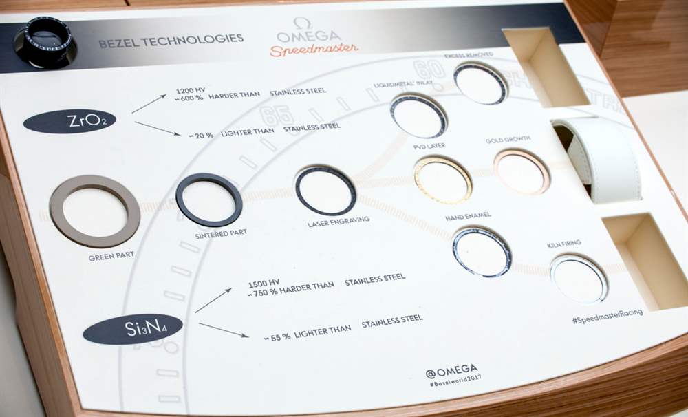 我提到邊框是新的。有兩種類型的邊框材料,陶瓷或氮化硅(取決于顏色,因為后一種材料用于灰色邊框)。然后,歐米茄使用液態金屬、Ceragold 或搪瓷作為測速儀表圈標記和文字。對我來說最有趣的是帶有白色琺瑯的黑色陶瓷表圈。后者用于白色表盤版本的表圈文字,因為白色文字需要明亮、永久的顏色來匹配表盤。對我來說,這些是最有趣的表盤(白色和黑圈子表盤),根據歐米茄的說法,每個烤琺瑯表圈都有五層琺瑯。