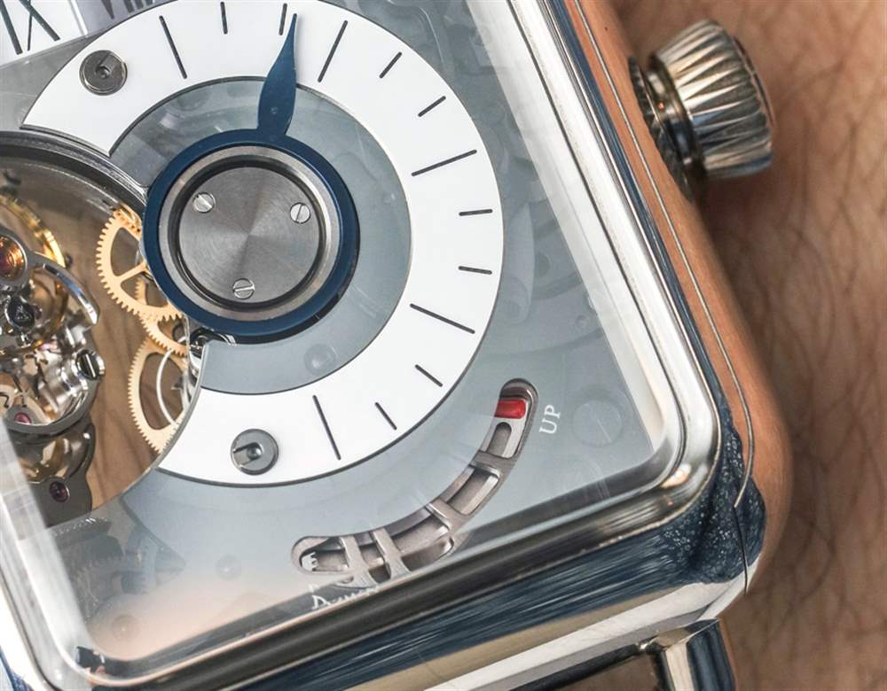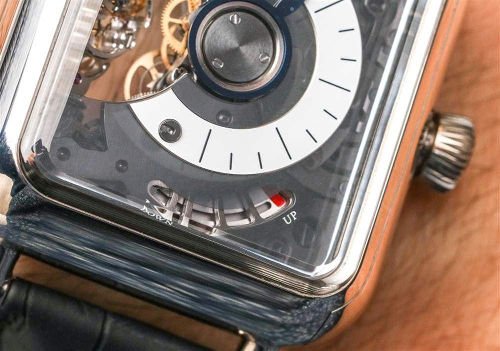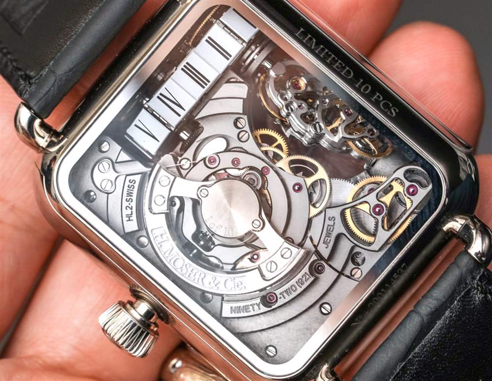 該機芯是帶有微型轉子的自動機芯,其中一個發條盒專門用于為時標鏈帶的復雜運動提供動力。機芯運作的真正美妙之處在于,每經過一小時,時標帶會緩慢移動幾秒鐘。這是一件很酷的事情。HL2.0 機芯還有一個分鐘逆跳指示器,在 H. Moser & Cie Swiss Alp Watch Minute Retrograde 時計上,該指針與白色大明火琺瑯表盤(采用傳統設計的藍鋼指針)相對。機芯底部是一個方便的動力儲存指示表盤——我一直很欣賞。