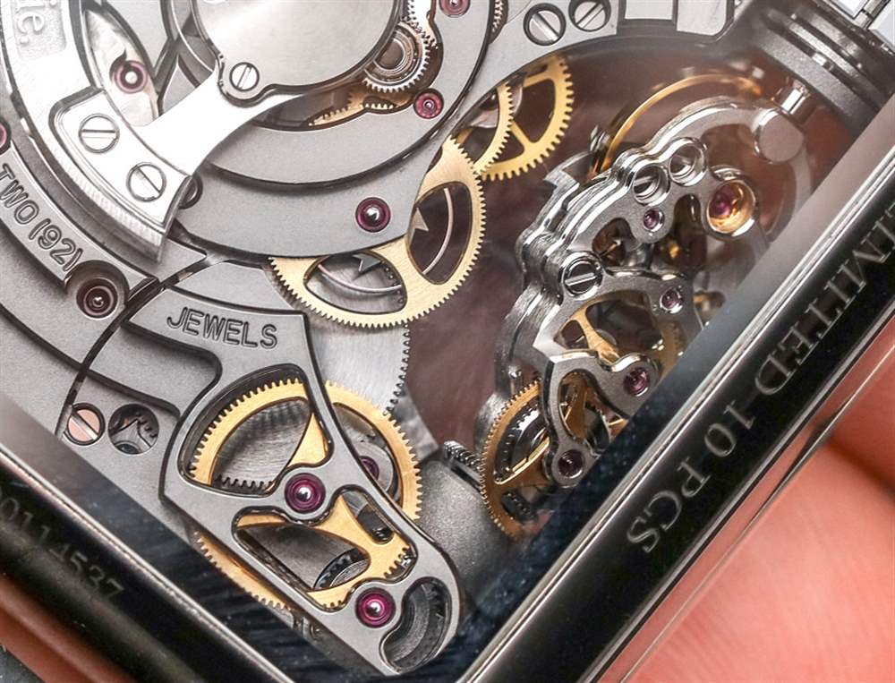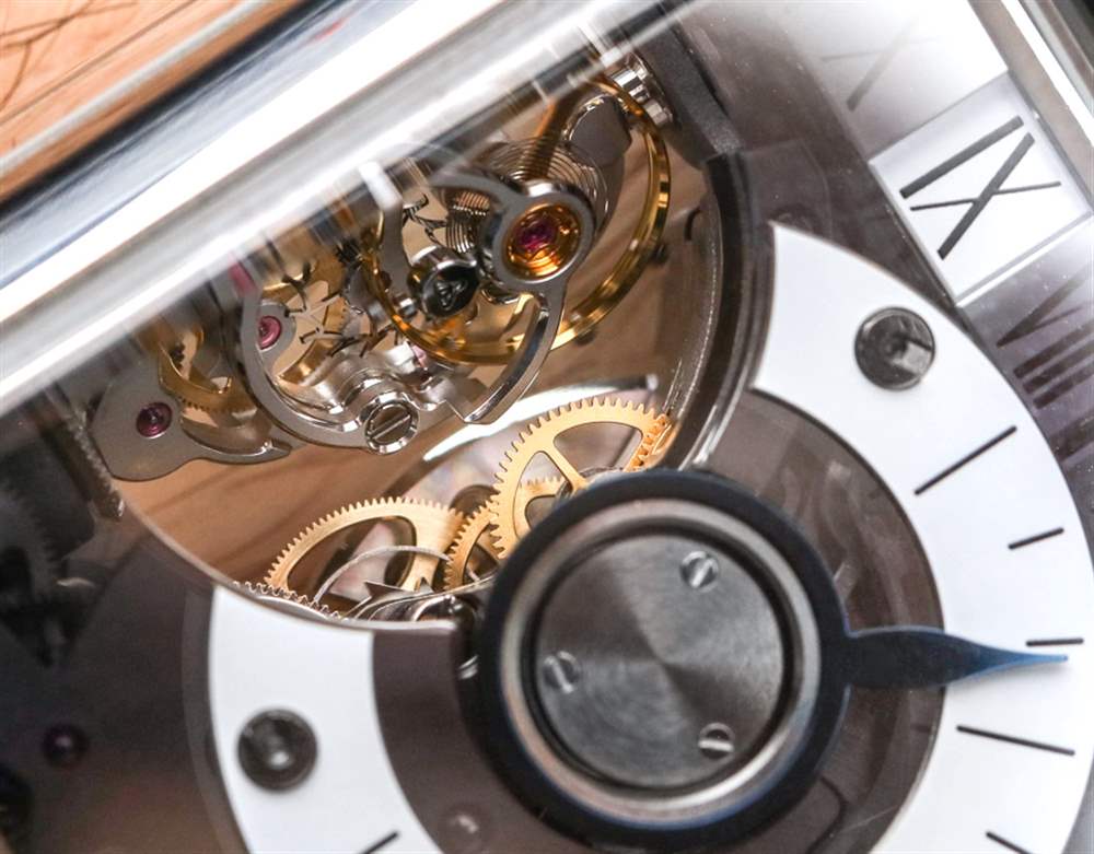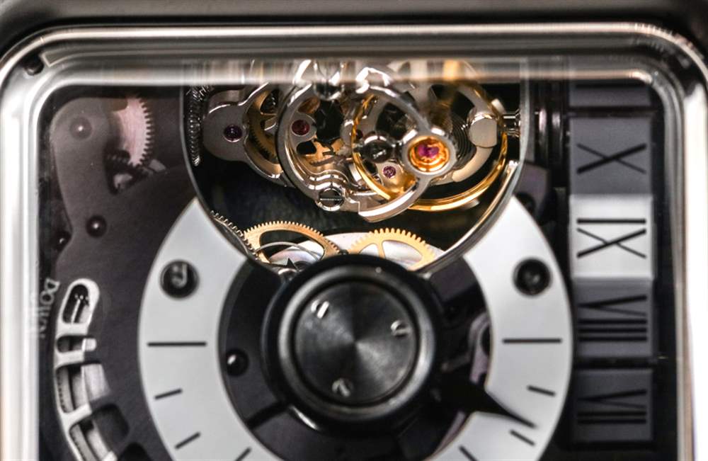 口徑 HL2.0 機芯有許多有趣的話題,從它自己的“陀飛輪”風格開始。擺輪調節系統是一個長的垂直組件,隨著用于指示跳躍時間的胎面的運動而轉動。您需要親自查看才能真正理解它,但在表殼頂部附近有一個小窗口,用于顯示小時(此處為羅馬數字),在每個小時結束時以一小時為單位移動。隨著每一小時的流逝,建立調節系統的柱子會旋轉一點,看到實際情況真的很有趣。擒縱系統的工作頻率為 18,000 次/小時(3 赫茲),機芯配備兩個主發條盒,動力儲存為 45 小時。