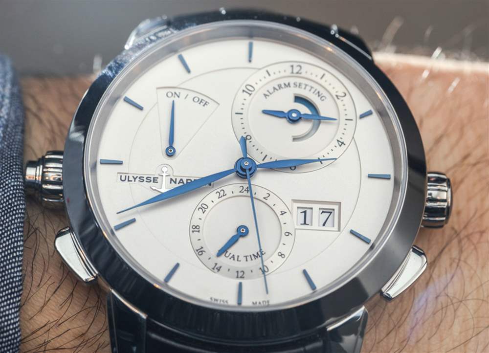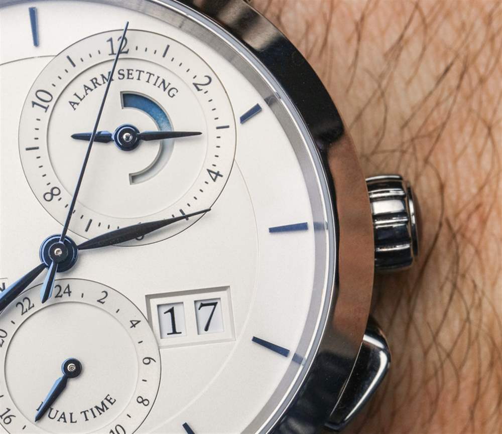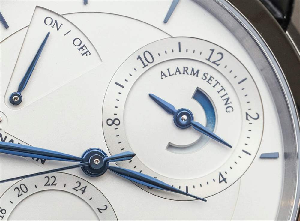 為了簡(jiǎn)單地解釋復(fù)雜性,我會(huì)說它提供時(shí)間、一個(gè)大日期指示器、帶有專用“前進(jìn)和后退”按鈕的雙時(shí)區(qū),以及一個(gè)獨(dú)特的警報(bào)系統(tǒng),它結(jié)合了傳統(tǒng)警報(bào)和一分鐘的提示音中繼器。請(qǐng)注意,鬧鈴設(shè)置轉(zhuǎn)盤中還有一個(gè)專用的動(dòng)力儲(chǔ)備指示器,可讓您了解鬧鈴彈簧是否有電。所有這些都在平衡但不對(duì)稱的表盤上進(jìn)行了相當(dāng)合乎邏輯和吸引力的布局。廣告訊息廣告信息結(jié)束
