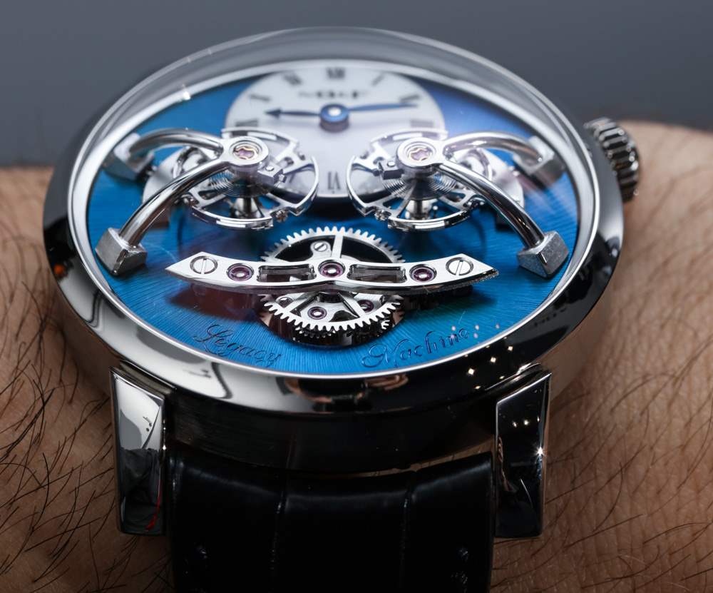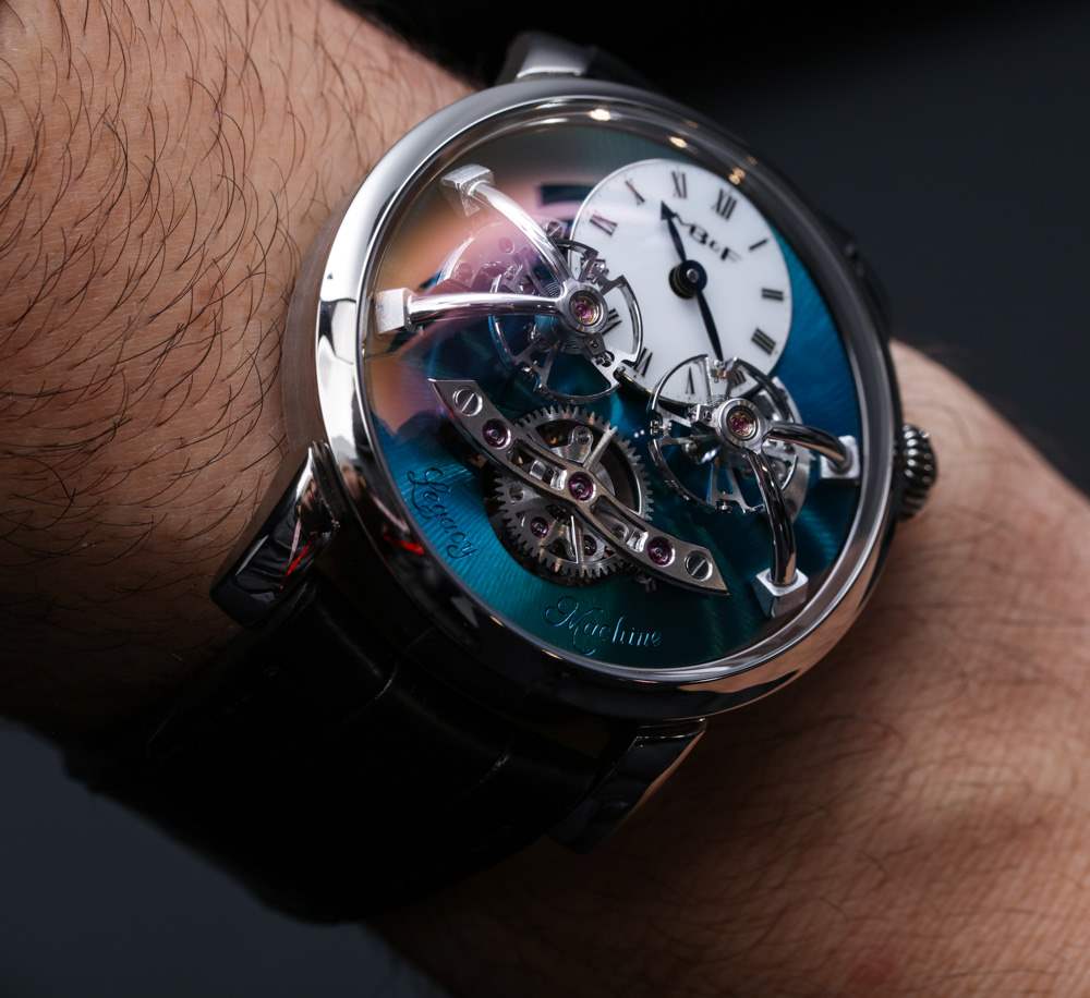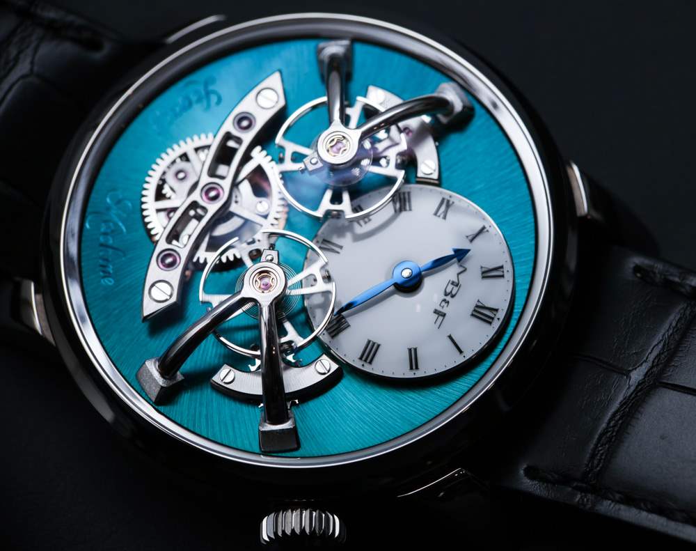 MB&F 顯然很享受讓他們的表盤供應(yīng)商使用飾面和著色工藝(我認(rèn)為這里是 PVD ??涂層工藝)。他們過去做過綠色,也做過藍(lán)色,現(xiàn)在他們提供了一種存在于中間某處的顏色,因?yàn)樗c光一起玩。有趣的是,MB&F 甚至沒有嘗試自己給這種顏色起個名字。表盤的其余部分由偏心的白色時間子表盤和藍(lán)色 18k 金時針和分針,以及平衡輪的雙拱形橋板和行星差速系統(tǒng)的視圖組成。當(dāng)您凝視著豐富的三維鐘表雕塑時,完成是一流的和華麗的。