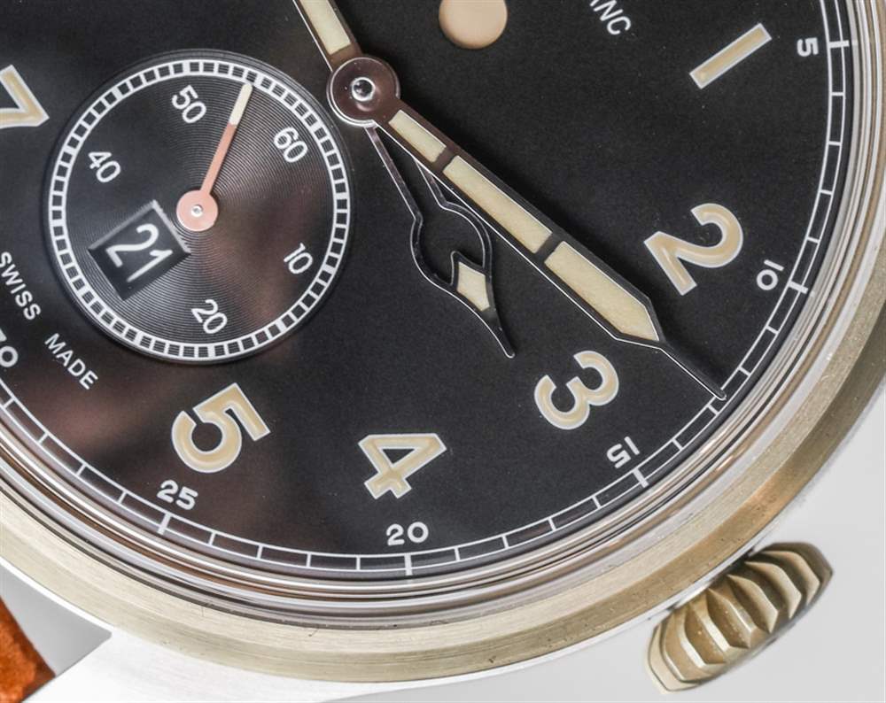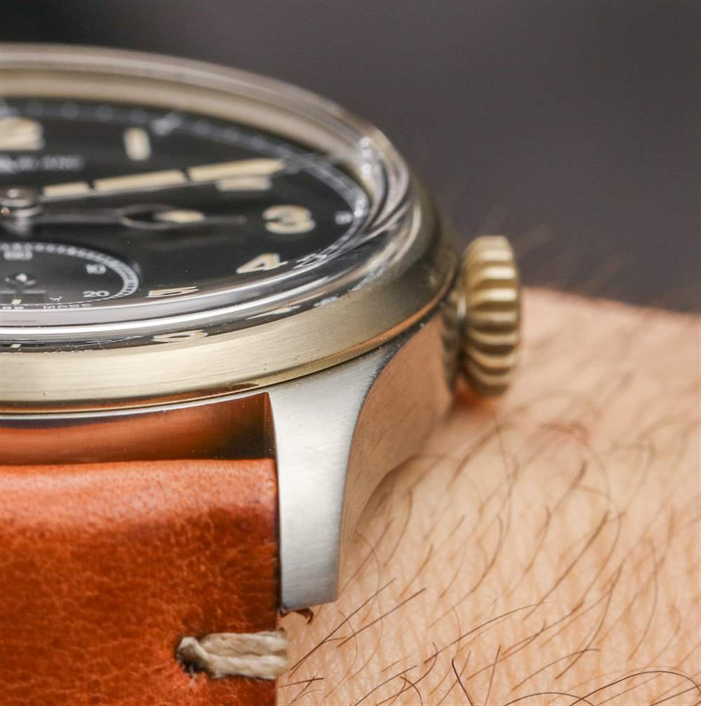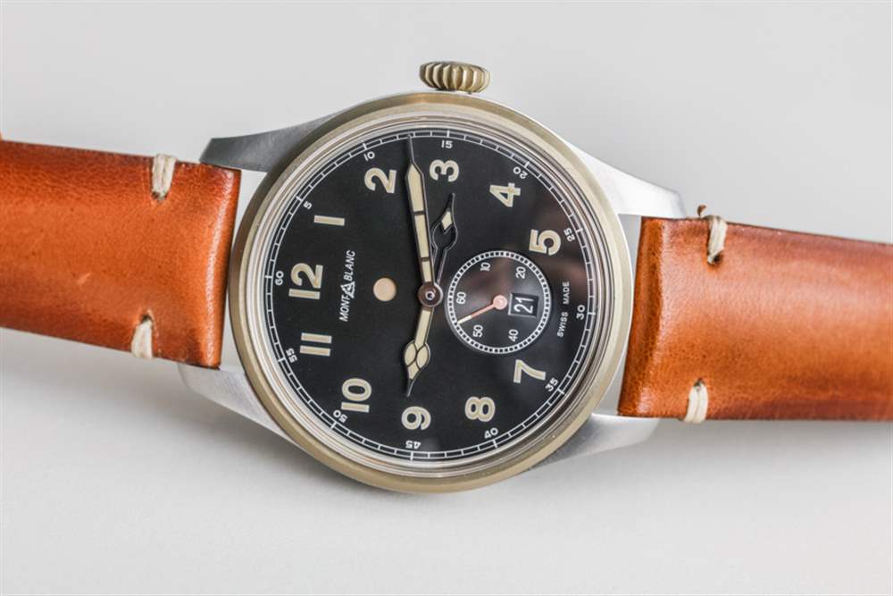 戴在手腕上的萬寶龍 1858 自動雙時腕表的尺寸為 44 毫米寬和 12.3 毫米厚(防水深度僅為 30 米)。主表殼為拉絲鋼,而表圈和表冠為青銅——這種材料會隨著時間的推移而產生古銅色。青銅在過去幾年一直是一種時尚材料,它與指針和時標上的發光體的陳舊外觀相匹配,它在這樣的手表中的整合非常巧妙。萬寶龍將這款腕表與舒適的“適合時代”、“陳年小牛皮”表帶搭配,采用迷人的干邑色。