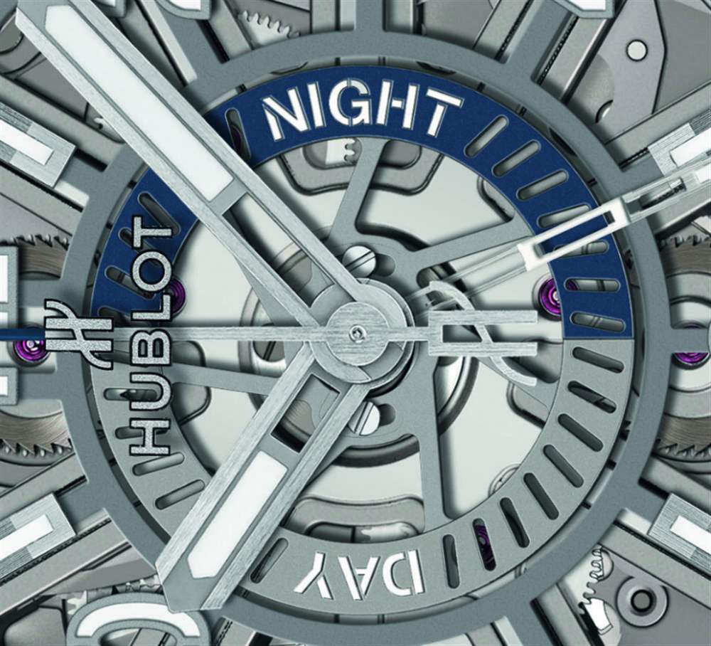 HUB1251 自動機芯由 339 個零件制成,工作頻率為 4 赫茲(28,800 次/小時),動力儲存三天(72 小時)。除了有兩個時針指示本地和家鄉時間外,還有一個特殊的日/夜盤用于指示第二時區的上午或下午。對我來說,這是一個非常重要的功能,因為在不使用 24 小時時間格式的 GMT 手表中,很難知道“本地時區”是白天還是黑夜。有了這個圓盤,宇舶表Big Bang UNICO GMT的佩戴者便擁有了非常清晰的兩個時區時間的獲知能力,具有高度的便利性和易讀性。