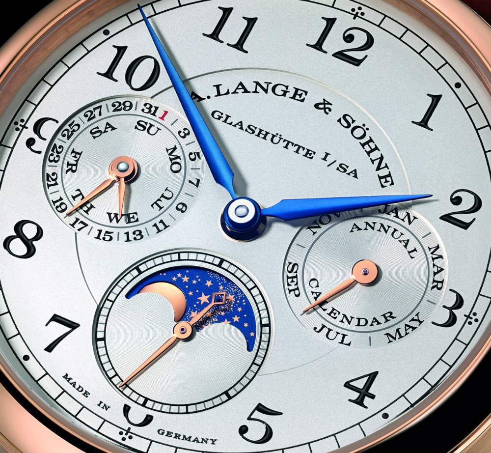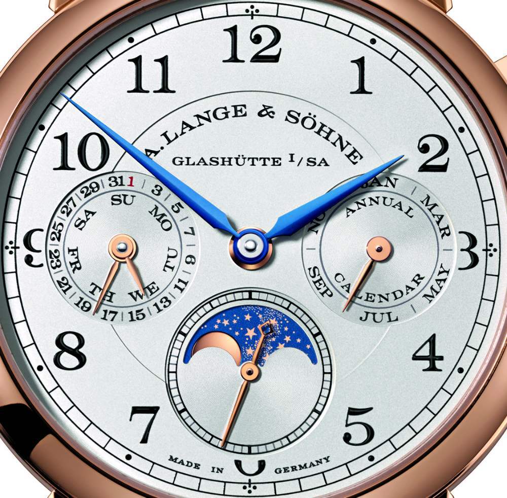 在功能方面,1815 年歷采用精美的藍鋼指針顯示時間,輔助秒針集成在 6 點鐘位置的月相顯示窗口中。其他兩個小表盤用于指示星期幾和日期(左小表盤)和月份(右小表盤)。雖然表盤對某些人來說可能有點文字繁重,但整體外觀非常平衡,是朗格標志性“超大”大日期指示器窗口的不錯替代品,該窗口在許多其他具有類似風格的萬年歷手表中都有. 一些完美主義者可能也不喜歡小表盤如何切斷 3 點鐘、6 點鐘和 9 點鐘的小時指示器,但權衡的是更大且更具視覺吸引力的小表盤。廣告訊息廣告信息結束